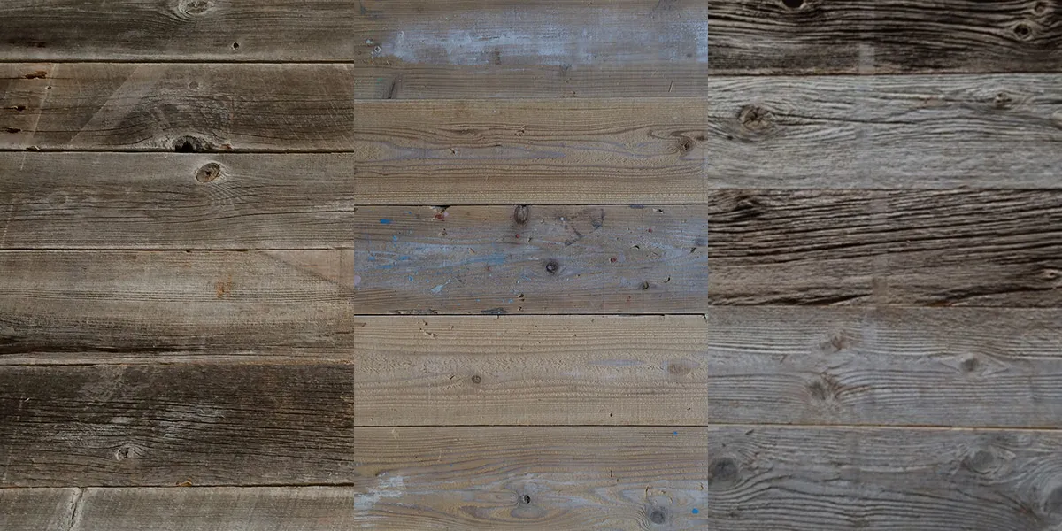 古材の表面からわずかに内部に入った部分を使用することで、ソフトな古材感と上品な仕上りを実現しました。ブラッシングとサンディング処理により表面のささくれやケバを抑え、古材の風合いを十分に保ちつつ実用性の高い仕上がりとなっています。