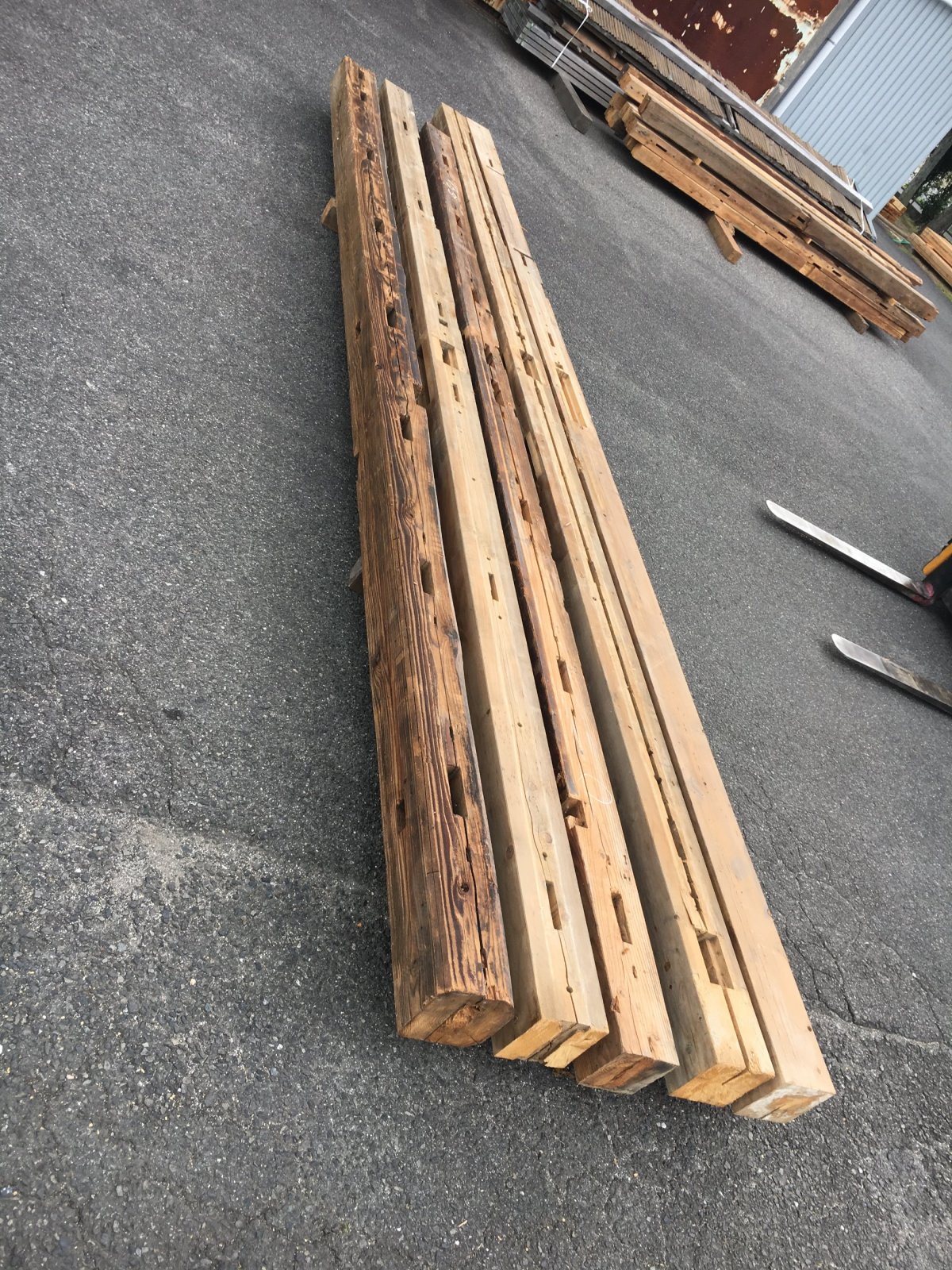柱材は細身で使いやすい上、ホゾ穴などの古材らしさも十分感じ取れる人気商品です。古民家を支える重要な部材ゆえ梁材とガッチリ組まれており採取が難しい素材ですが、皆様へ安定して供給するため日々コツコツと収集に励んでおります。上質な柱材を是非ご活用ください。