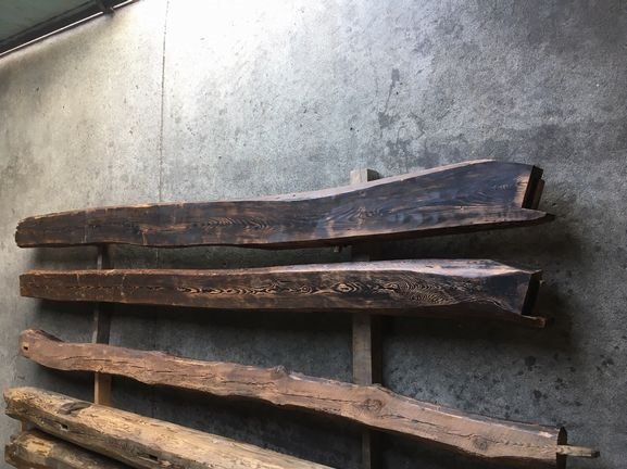 古材でもっともポピュラーな丸太。その形、表情は千差万別。スラッと穏やかなものもあれば、曲がりくねって暴れているもの、、、凹凸のないプレーンな表情のものもあれば、大工さんが刻んだ模様が入ったもの、、、1本1本全てがそれぞれの個性をもつ、まさに古材らしい古材です。人間のように個性あふれる丸太から、みなさんと相性のいい古材を見つけてください。
