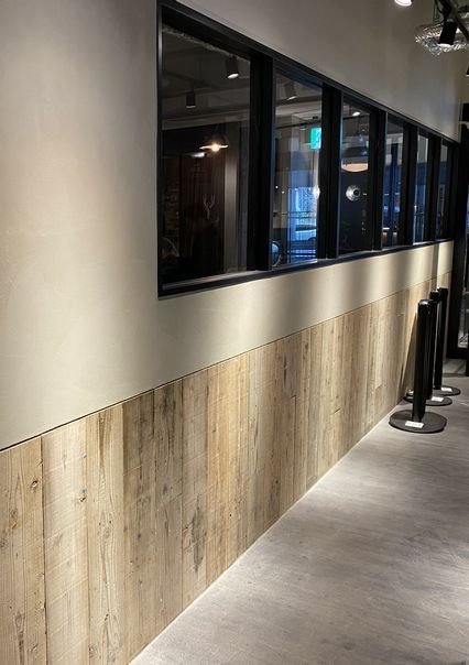 ユーズドプレーンに不燃処理を施し、不燃材料として仕上げました。公共施設や百貨店・ショッピングモール・アーケード等の商業施設など、不燃材料の使用が義務付けられている場所においても古材を利用することができます。