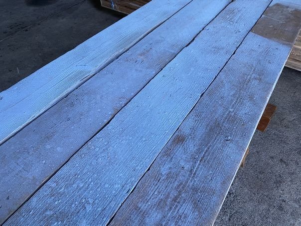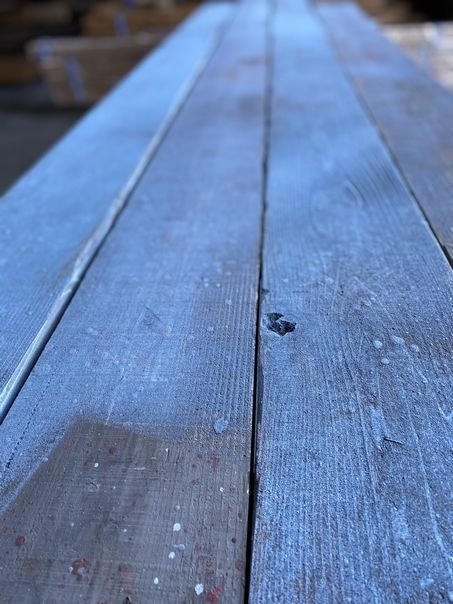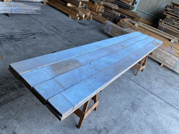 足場板はクリーニングや加工をしてユーズドプレーンとして販売をしておりますが、今回の入荷分は、塗装工事の足場に使われていたのか、鮮やかなブルー色が一面に広がっています。