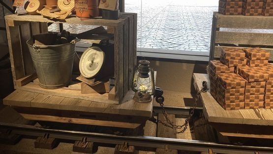 木箱が載っているトロッコと天井からつるされた梯子は、ユーズドプレーンです