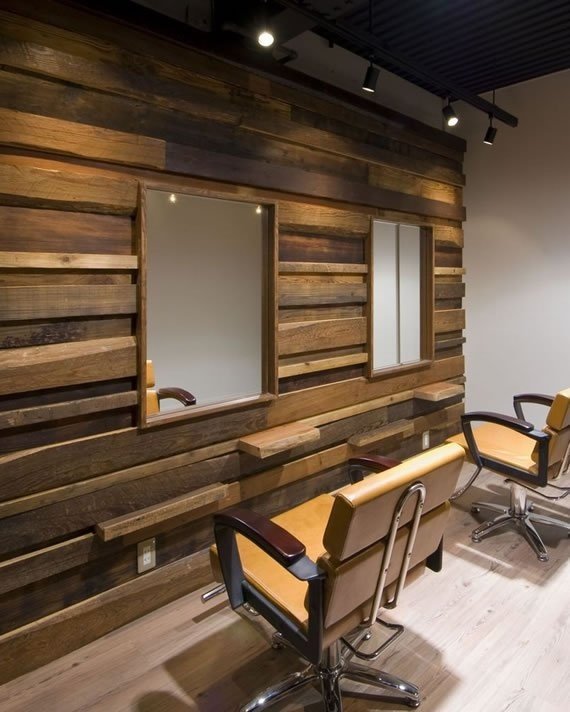 こちらの美容室では、壁面と天井に古材を効果的に使用し、温かみのある落ち着いた雰囲気を演出しています。