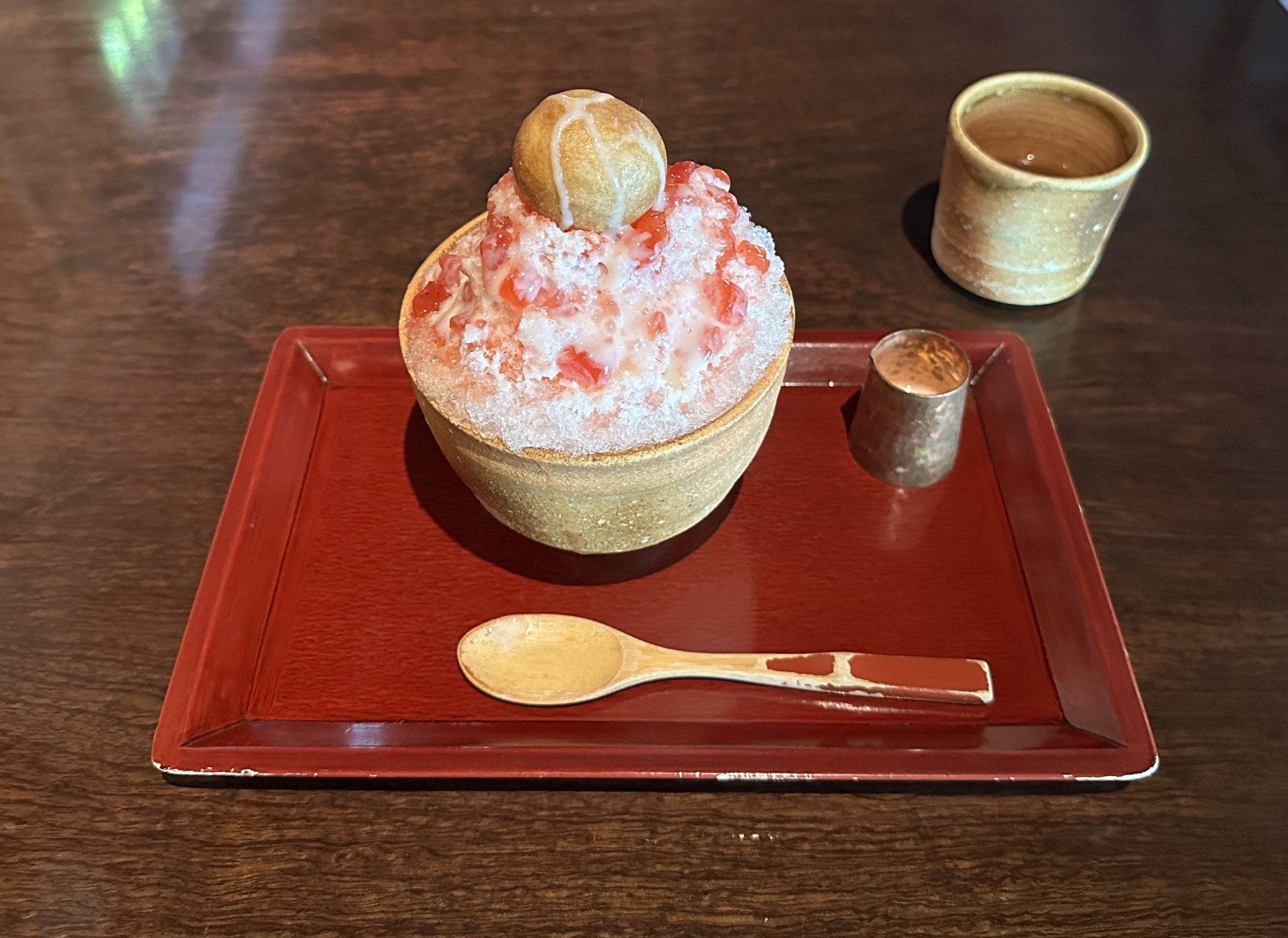 あまり暑いので つぶら氷 いちごをいただきました。つぶら餅が香ばしくておいしかったです。
