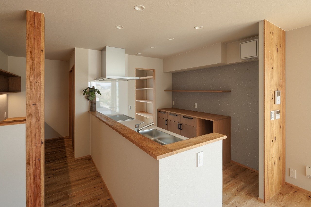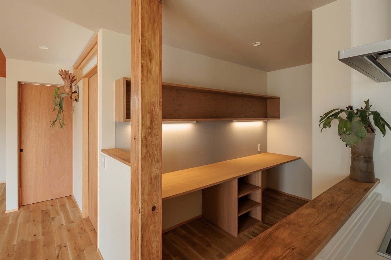 キッチンの笠木と柱にモクジスボードを貼っていただいております。