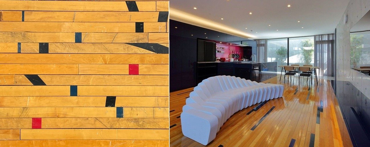 アメリカの体育館から回収したフローリング材。カラフルなコートラインが特徴的で、軽快で遊び心溢れる表情が生まれます。