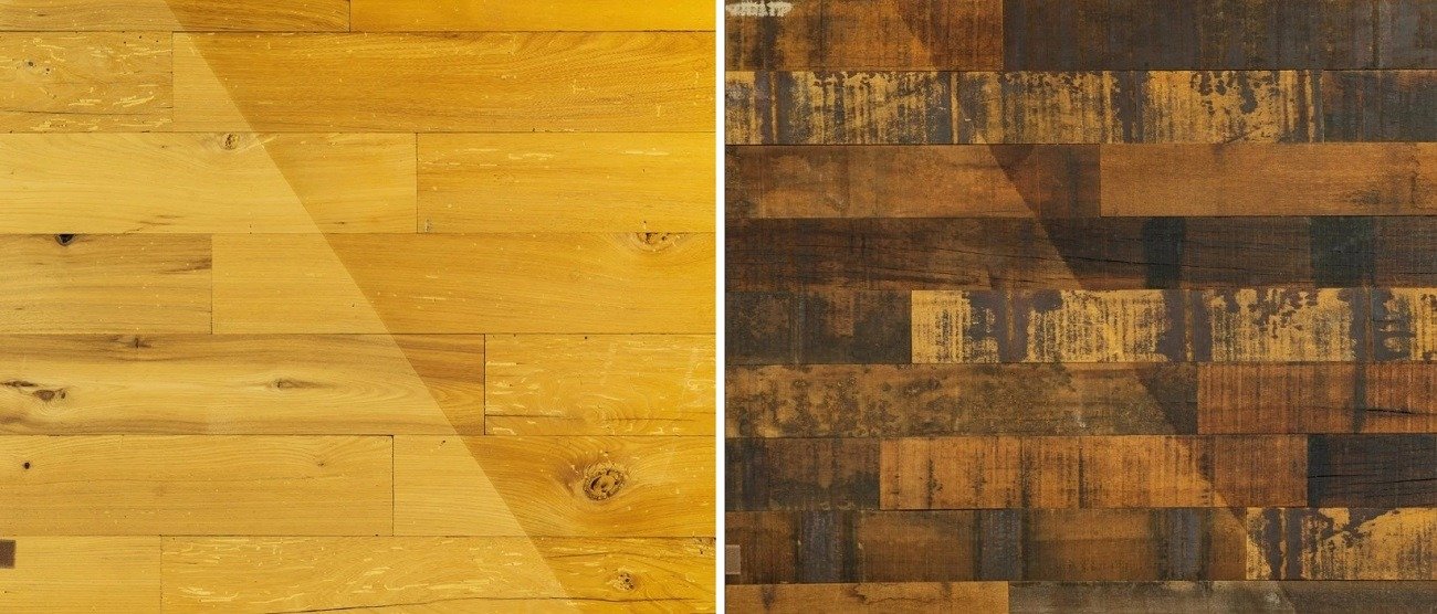 アメリカ北東部の歴史的な建物や工場で使われていた広葉樹を再利用した古材。