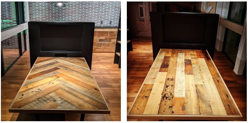 こちらの天板は、個性豊かな古材を、熟練の古材家具職人が、1ピースずつ丁寧に組み合わせた逸品。一枚一枚に個性がある世界で1枚だけの完全なオリジナルです。古材の魅力を存分に味わえる作品をぜひ一度ご覧になってください。