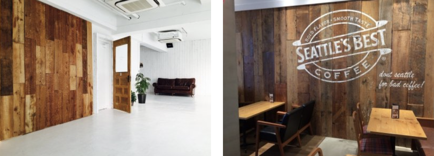 例えば、店舗の場合、壁だけでなく商品棚の一部に取り入れたり、カウンターに使われることもあります。壁に使用する場合は、ブラウンの素材と組み合わせながら個性的にデザインすることも可能です。飲食店や雑貨屋など、幅広く活用されています。