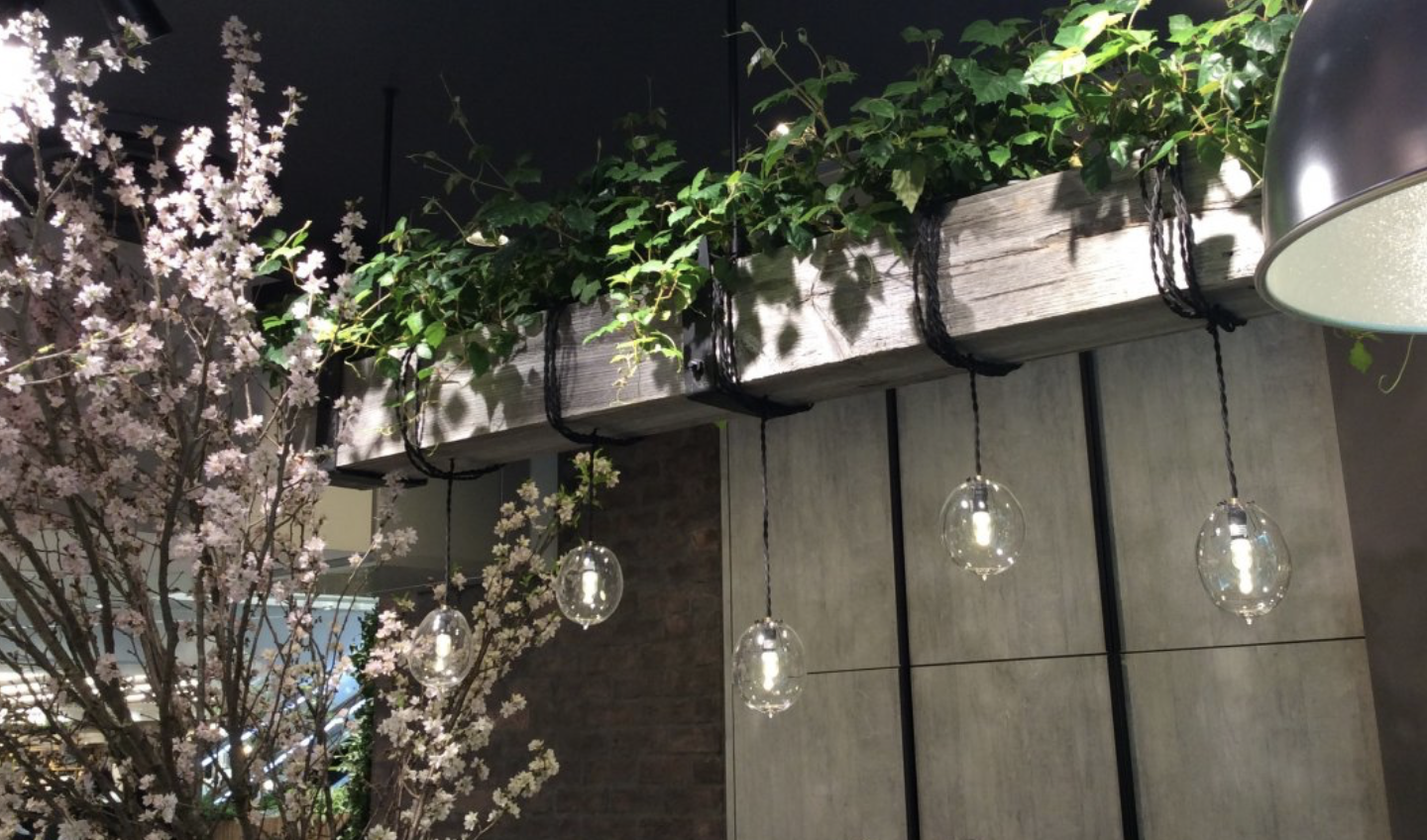 また、照明飾りにもUSボードのグレーが使用されています。ブラウンでは照明で木材が明るく照らされてしまいますが、グレーなら優しい光が店内を照らし植物をキレイに引き立てることができますね。