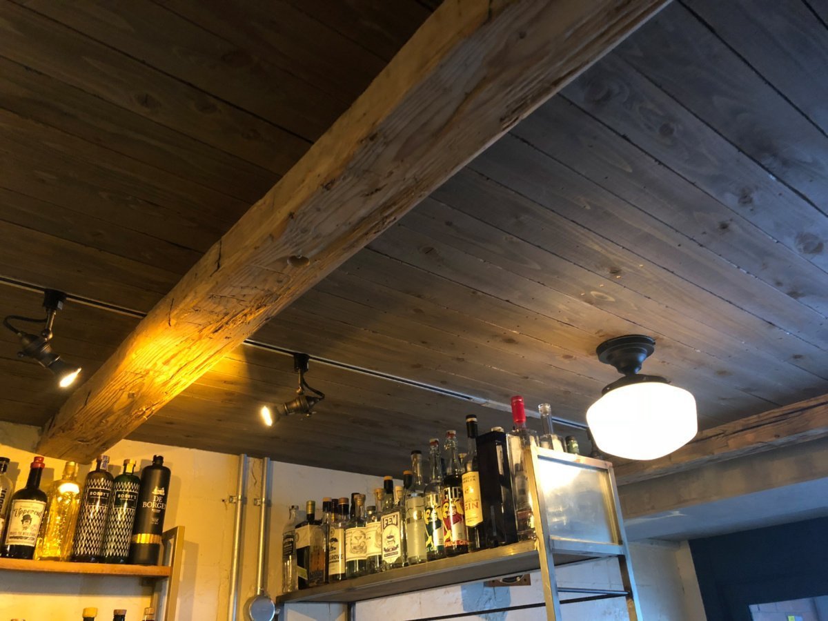 渋谷区西原にある「Bistro&Bar Chelsea」では、古材梁を設置して空間に独特のぬくもりやアンティーク感を演出しています。使用したのは、アメリカから輸入されたUSビーム(ハンドヒューンビーム)。存在感を活かしつつも、空間を圧迫しないように半割にし、絶妙なサイズ感で空間に溶け込ませるデザイナーのセンスが際立ちます。むき出しのダクトなどのモダンな要素と古材梁の絶妙な対比は、アンティークと現代が融合したユニークなデザインです。