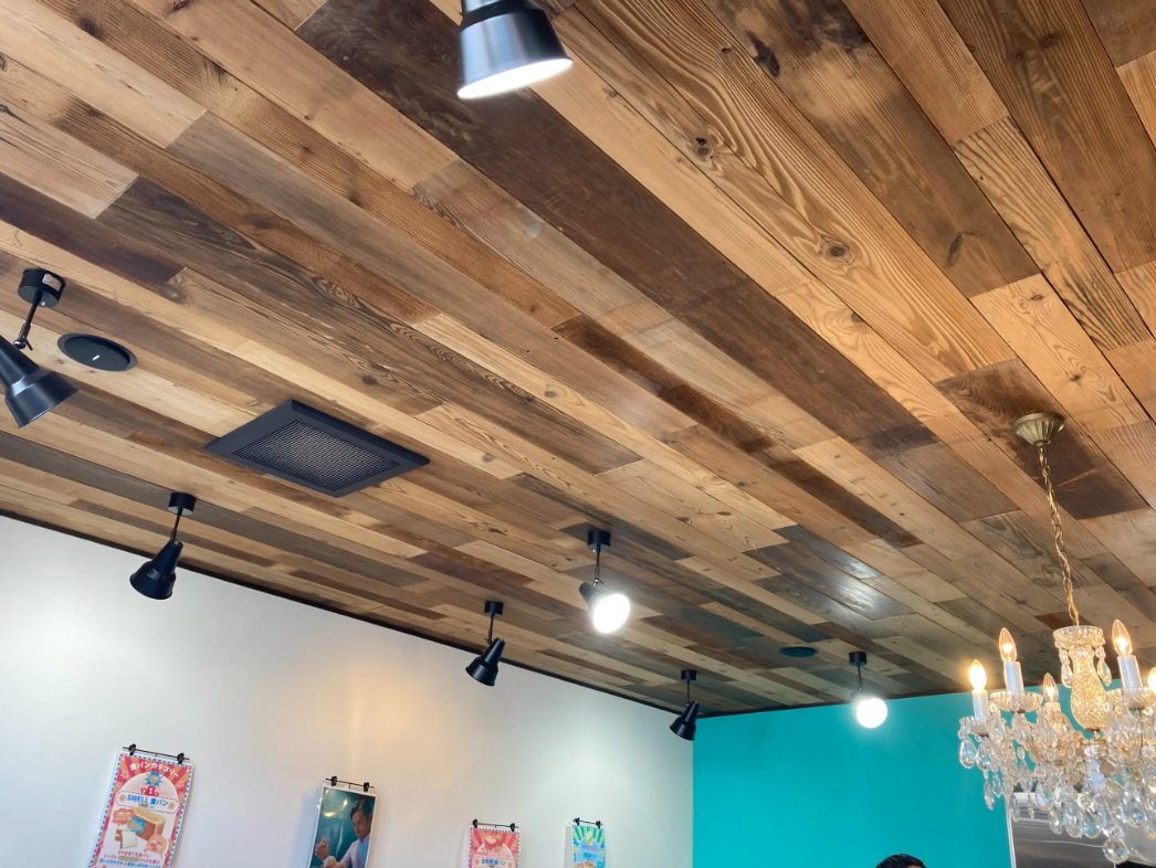 カウンター腰や棚の扉にも古材が取り入れられていますが、今回は特に天井に注目。