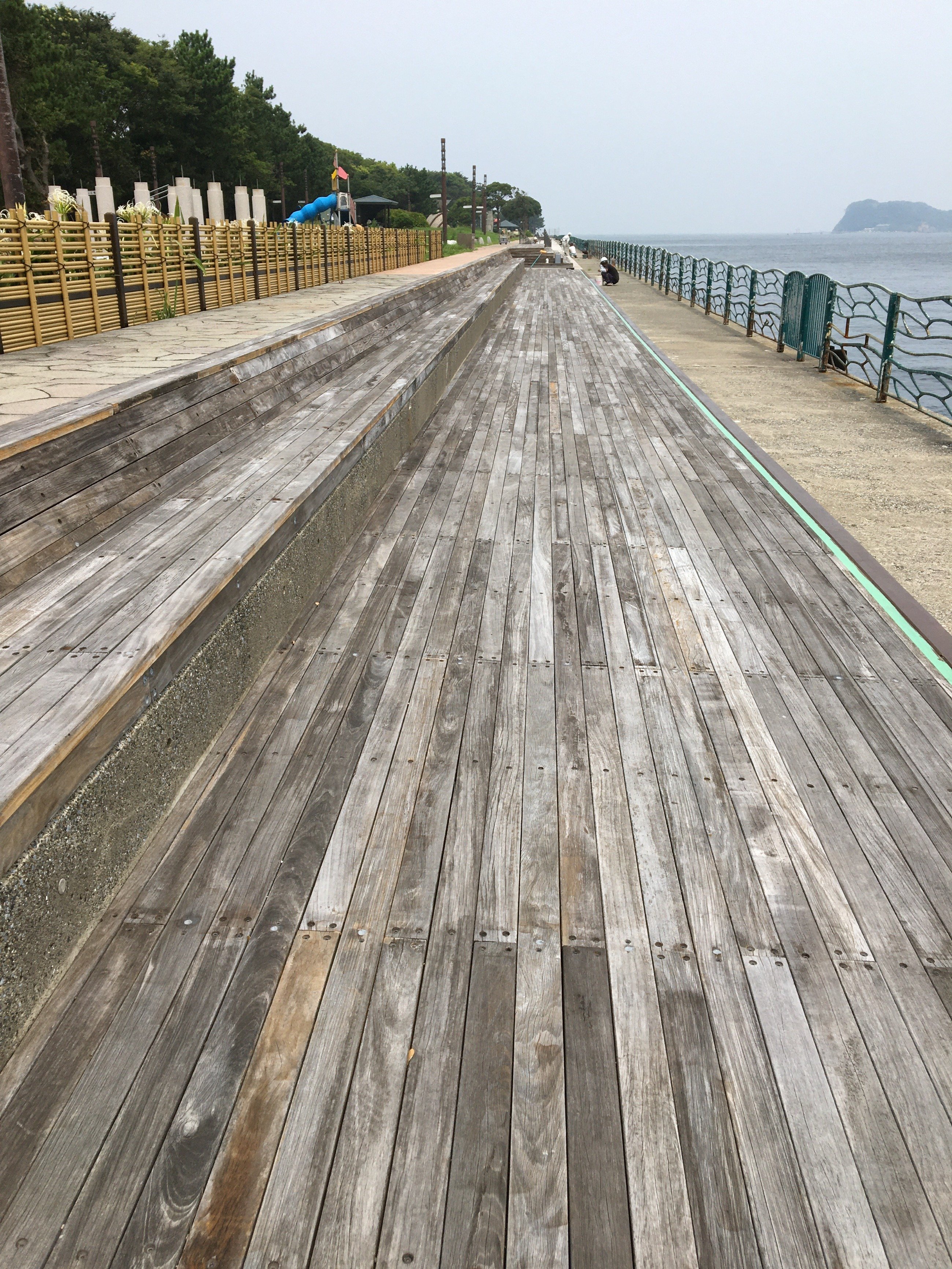これは、横須賀市の海辺つり公園で使用されていたデッキ材を再利用したもの。