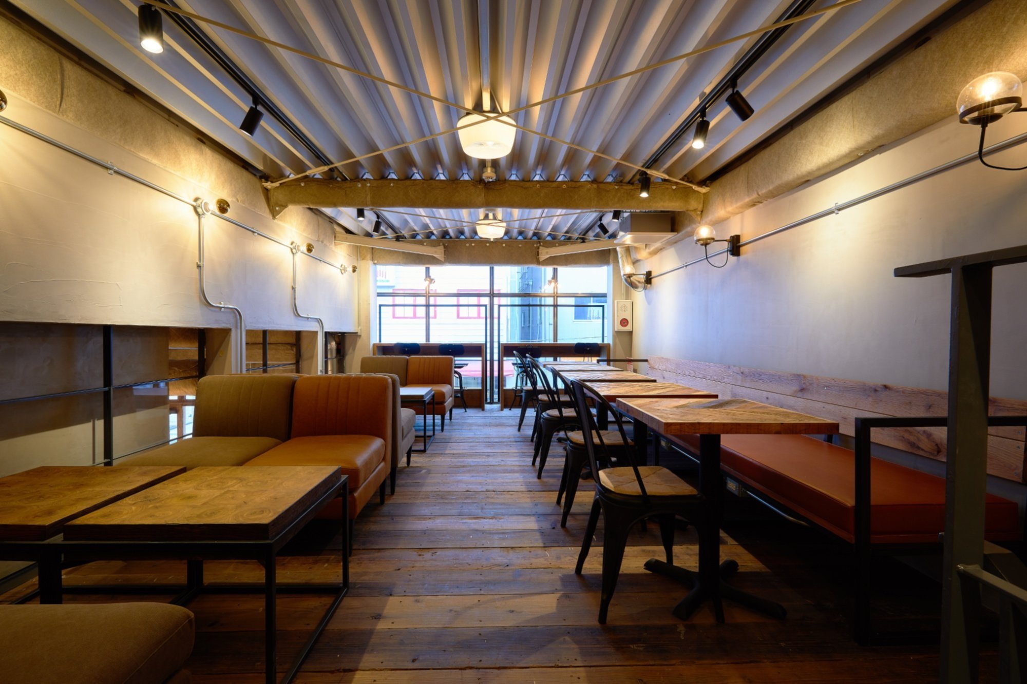 店内は、天井の配管や梁をあえて露出させたインダストリアルなデザインが目を引きます。古材テーブルやレザーなど温かみのある素材を巧みに組み合わせ、モダンで居心地の良い空間を造り出しています。