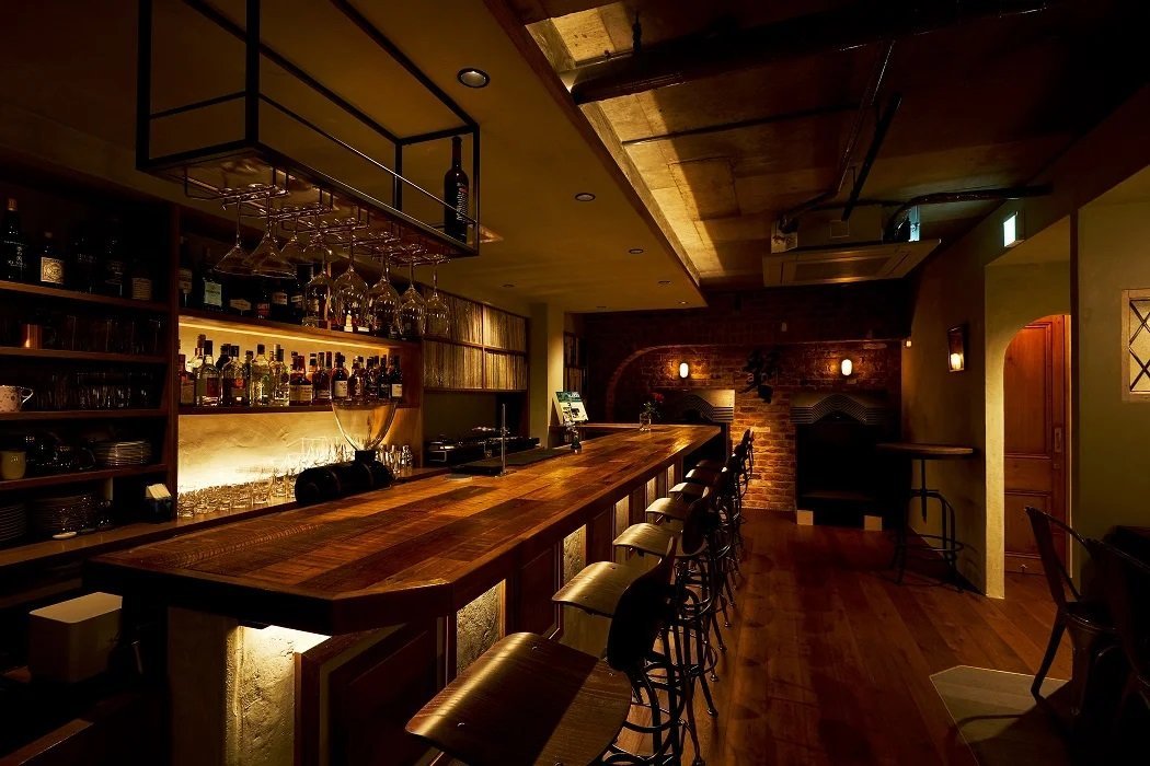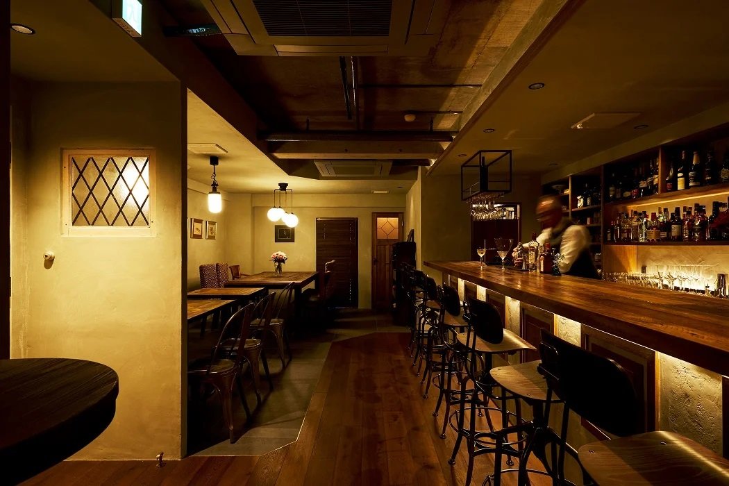 インテリアや照明器具との組み合わせにより、ジャズバーならではの洗練された雰囲気と、古材の持つ歴史的な重みが見事に調和しています。