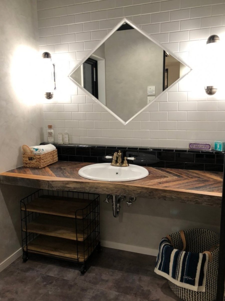 古材の自然な凹凸や経年変化による風合いは、日常的に使用する洗面スペースに独特の表情を与え、まるでホテルのような贅沢な空間を作り出しています。