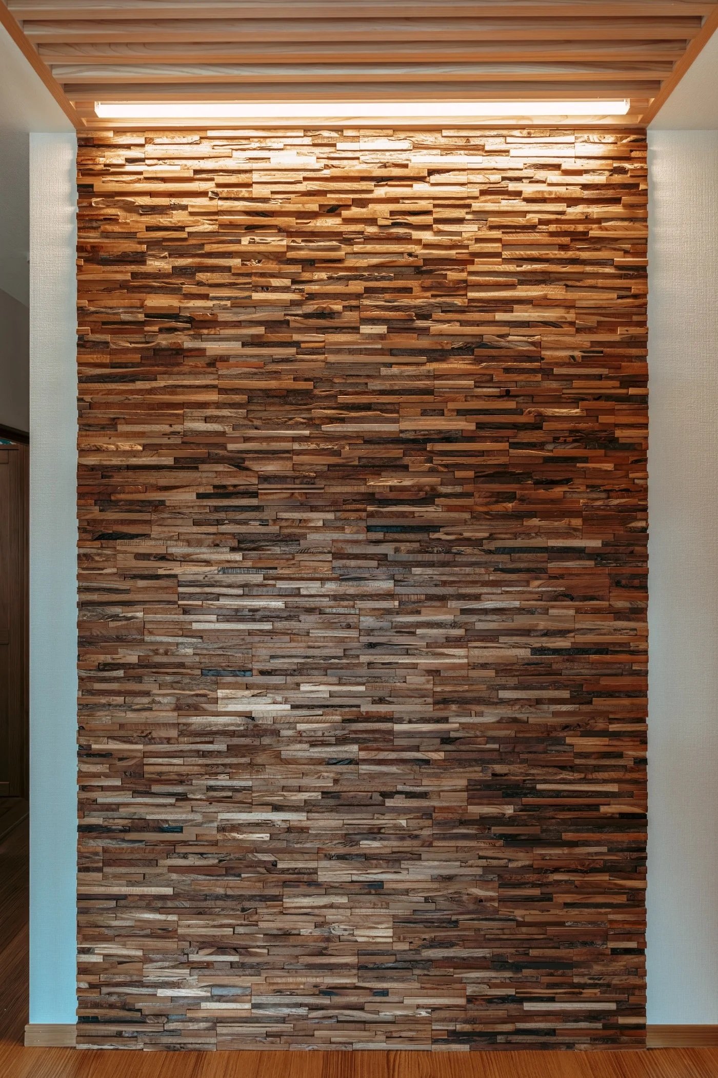 秋田市の一般住宅では、玄関正面の壁一面にチークウォールパネル「リンジャニ」を贅沢に使用しました。インドネシアの古民家から再生された貴重なチーク材が、エントランスに圧倒的な存在感を与えています。