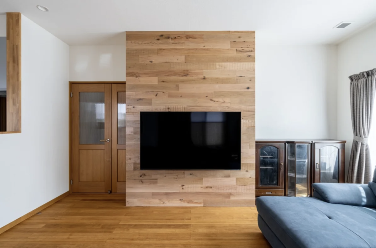 たとえば、濃淡のある色合いや素朴な質感の古材板を使えば、インテリアとしても主張しすぎず、それでいてしっかりとしたテレビの存在感を出してくれます。