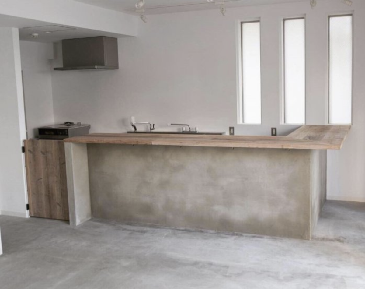 カウンターテーブルに古材足場板を用いることで、ホッと一息つける落ち着いた空間が広がります。