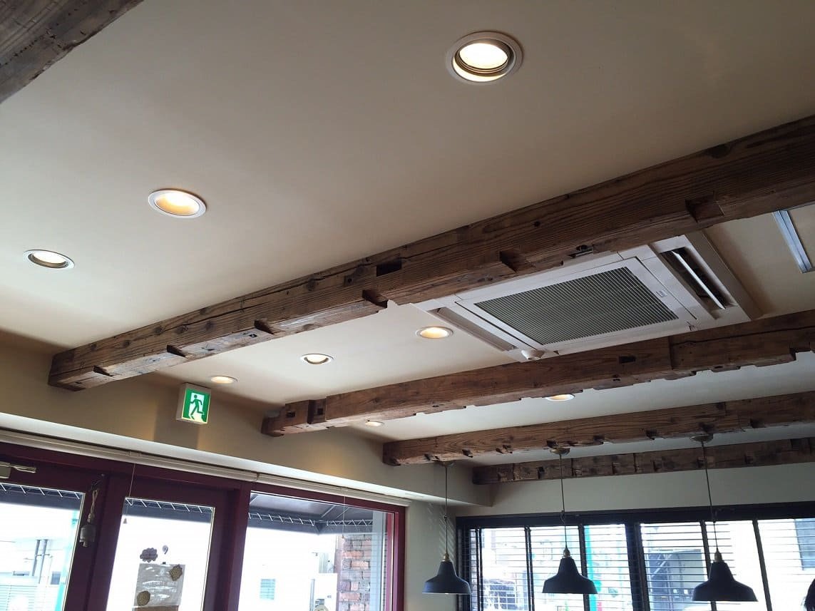 東京都葛飾区四つ木の「長楽製パン」様では、古材付柱を天井のアクセントとしてご利用いただいております。