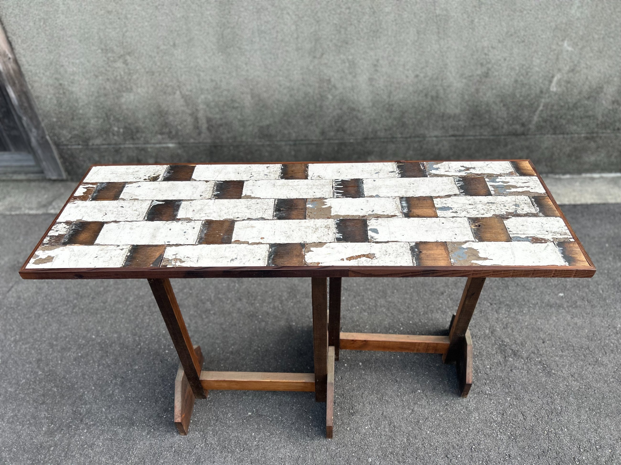 駅舎のメンテナンスのために塗り重ねられたホワイトペイントと、古材の中身から切り出した板材のコントラストが美しい逸品です。角の部分も加工が難しい板をつき合わせたデザインとなっており、作り手のこだわりが感じられます。