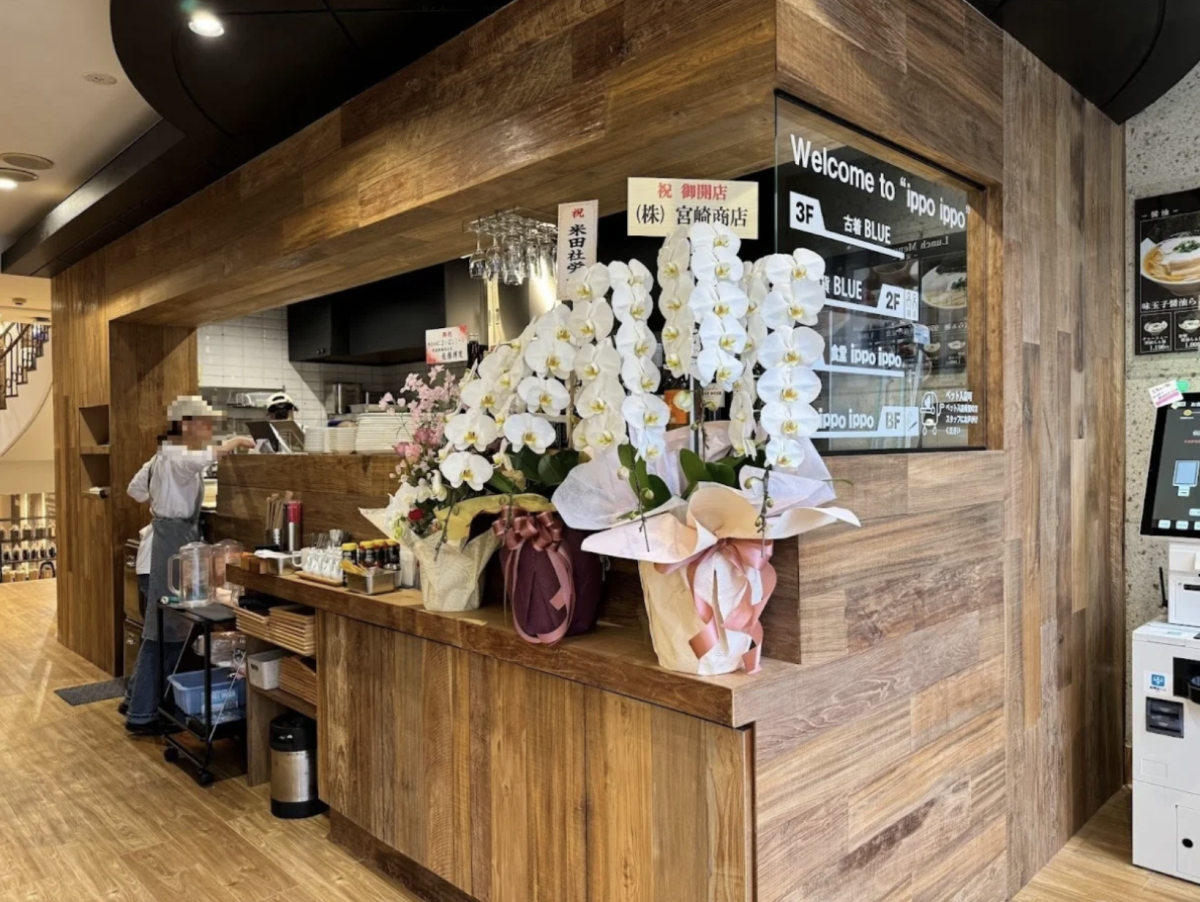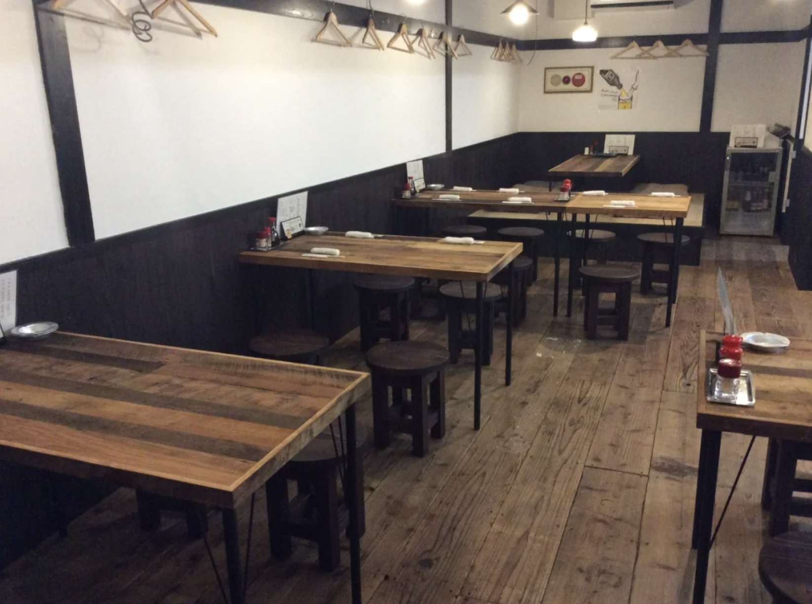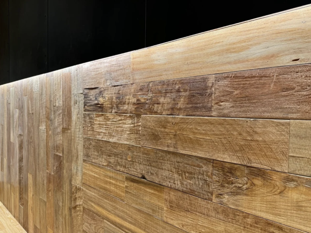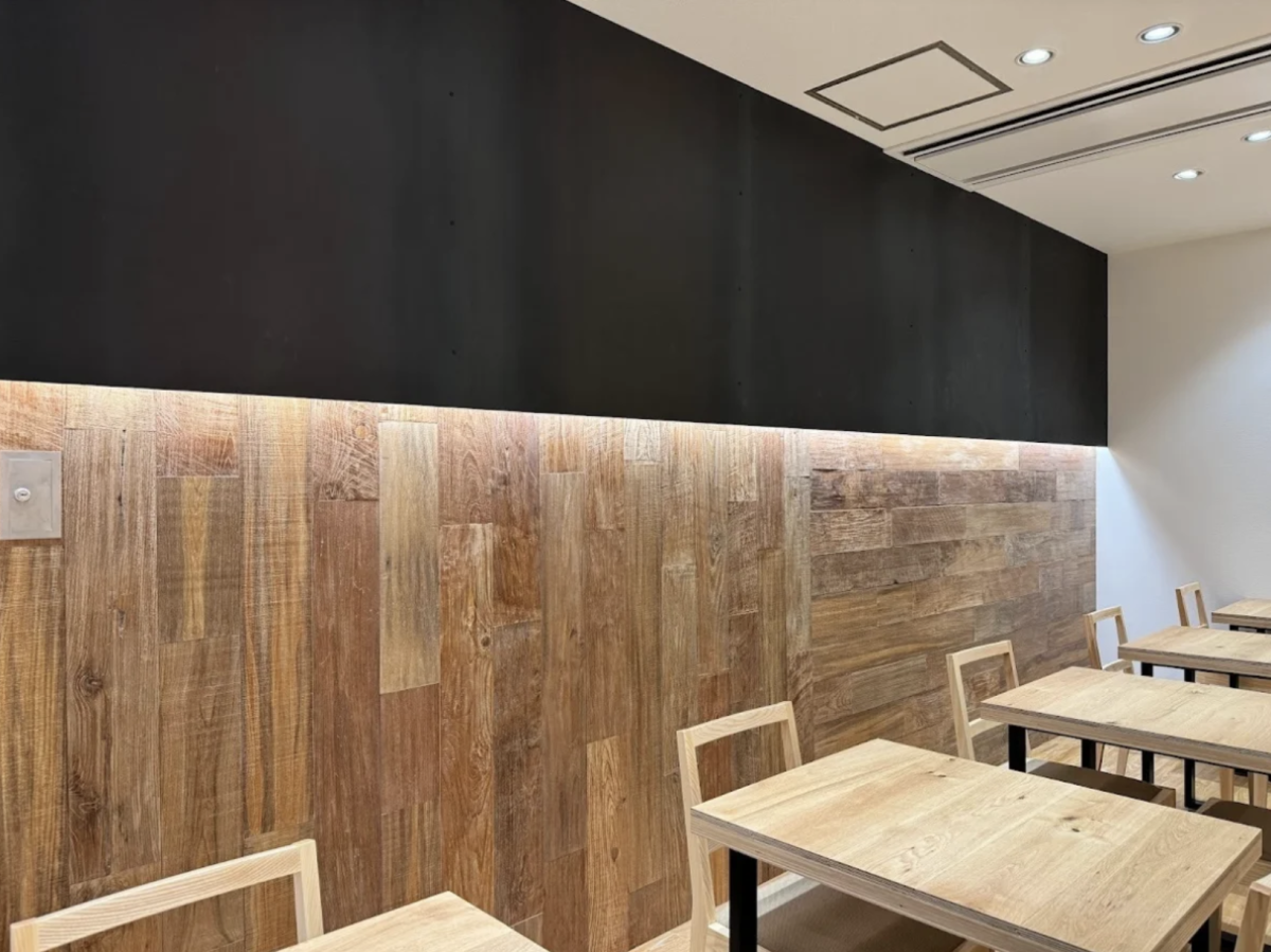 ラーメンやカレーライス、唐揚げ定食など、豊富なメニューでお腹を満たせる「食堂 ippo ippo」様では、古材日和の「LAMELLA ラメラ(チークパネル)」を活用いただいております。