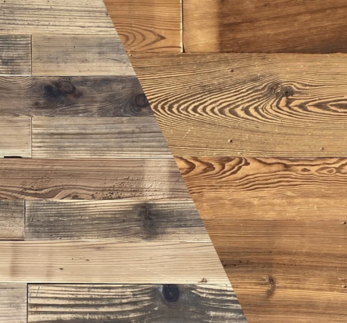 不燃古材とは、築60年から70年以上の古民家や歴史ある建物から取り出された古材に、不燃処理を施した材料のことです。