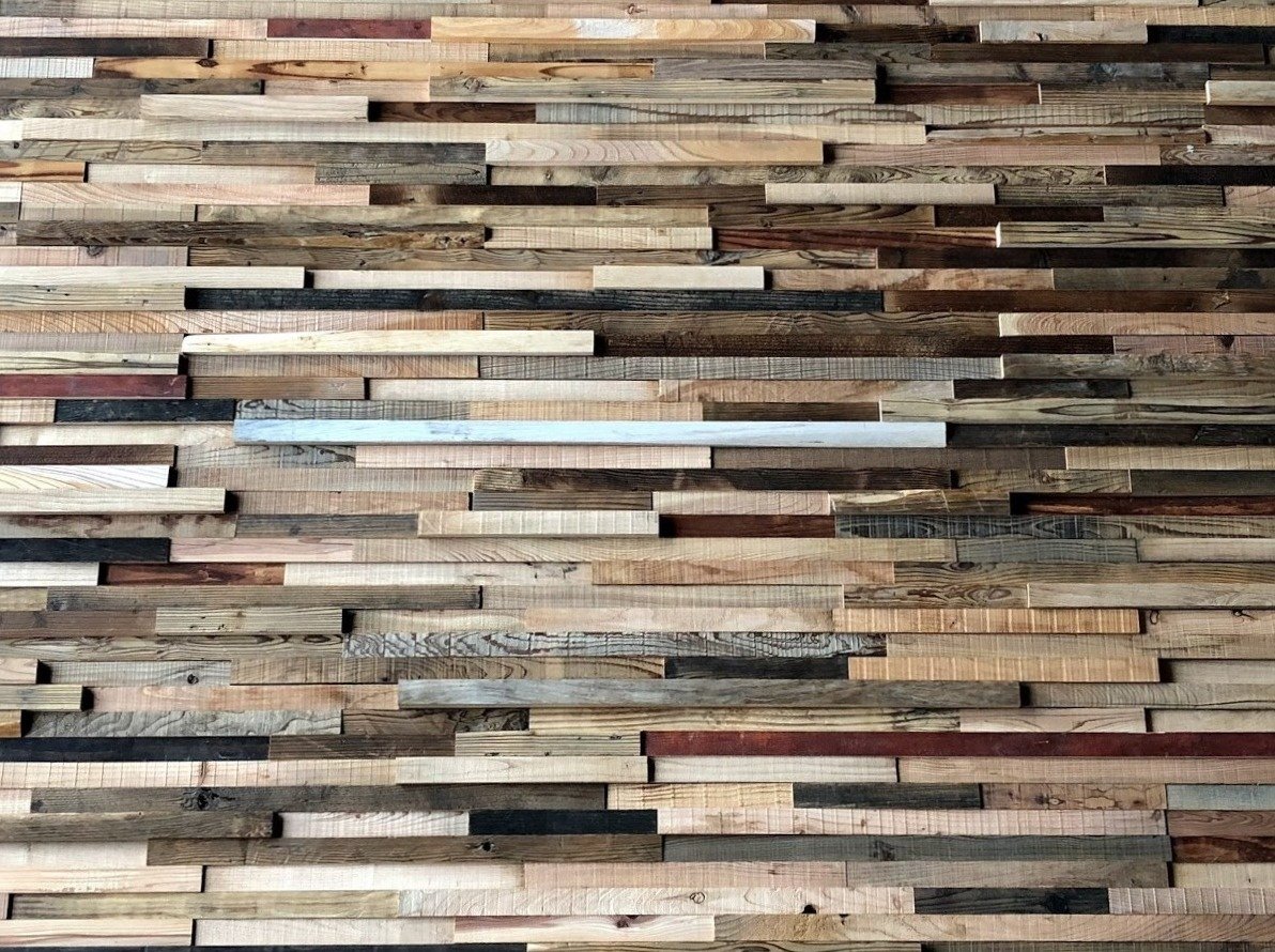 古材の板材を張るのではなく、梁材を製材カットし敷き詰める。古材の重厚感と自然美が、壁に命を吹き込み、様々な表情を生む。 個々の異なる風合が色彩を、凹凸が陰陽を生み出す。 ライティングと自然光で、一日中少しずつ表情を変化させる古材の壁は、一世紀前の匠の技術と、現代のデザイナーの感性が生み出した、唯一無二の作品となる。
