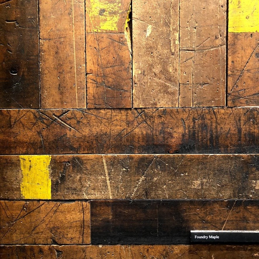 工場や倉庫の床板を回収したファウンドリー メープルには、何世紀にもわたり使い込まれた傷跡が色濃く残されています。