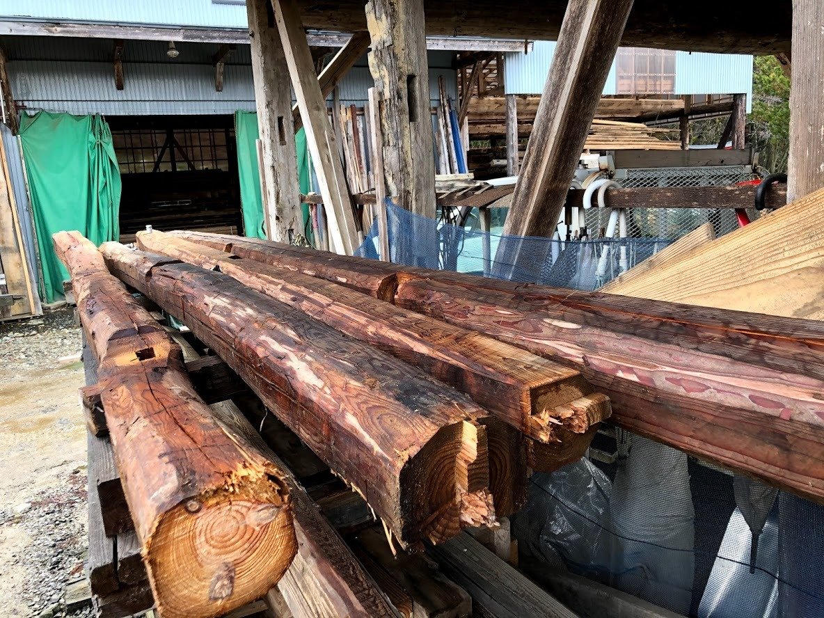 当社バックヤードにて130mm角程度の国産松材をご提案しております。