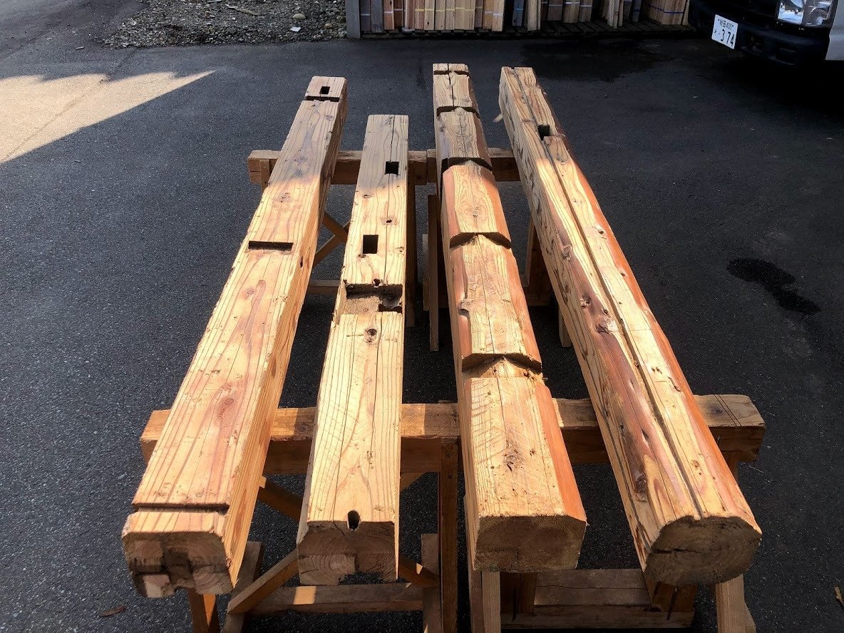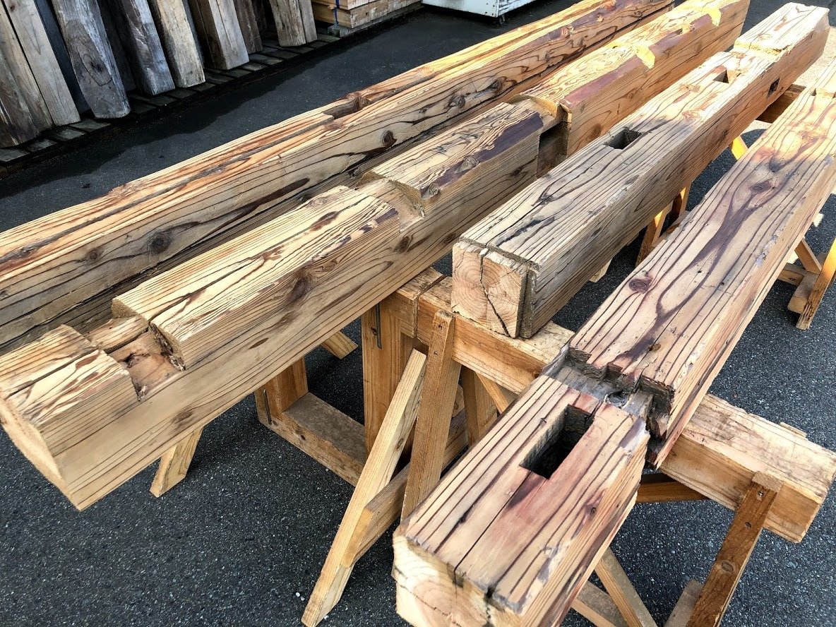 柱材は細身で使いやすい上、ホゾ穴などの古材らしさも十分感じ取れる人気商品です。古民家を支える重要な部材ゆえ梁材とガッチリ組まれており採取が難しい素材ですが、皆様へ安定して供給するため日々コツコツと収集に励んでおります。上質な柱材を是非ご活用ください。