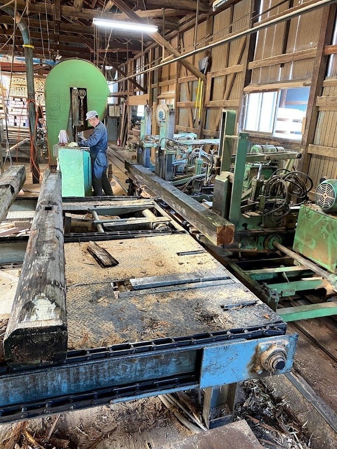古材の製材も見えない釘を挽くリスクがあるため当社専用の帯鋸を使い行います。