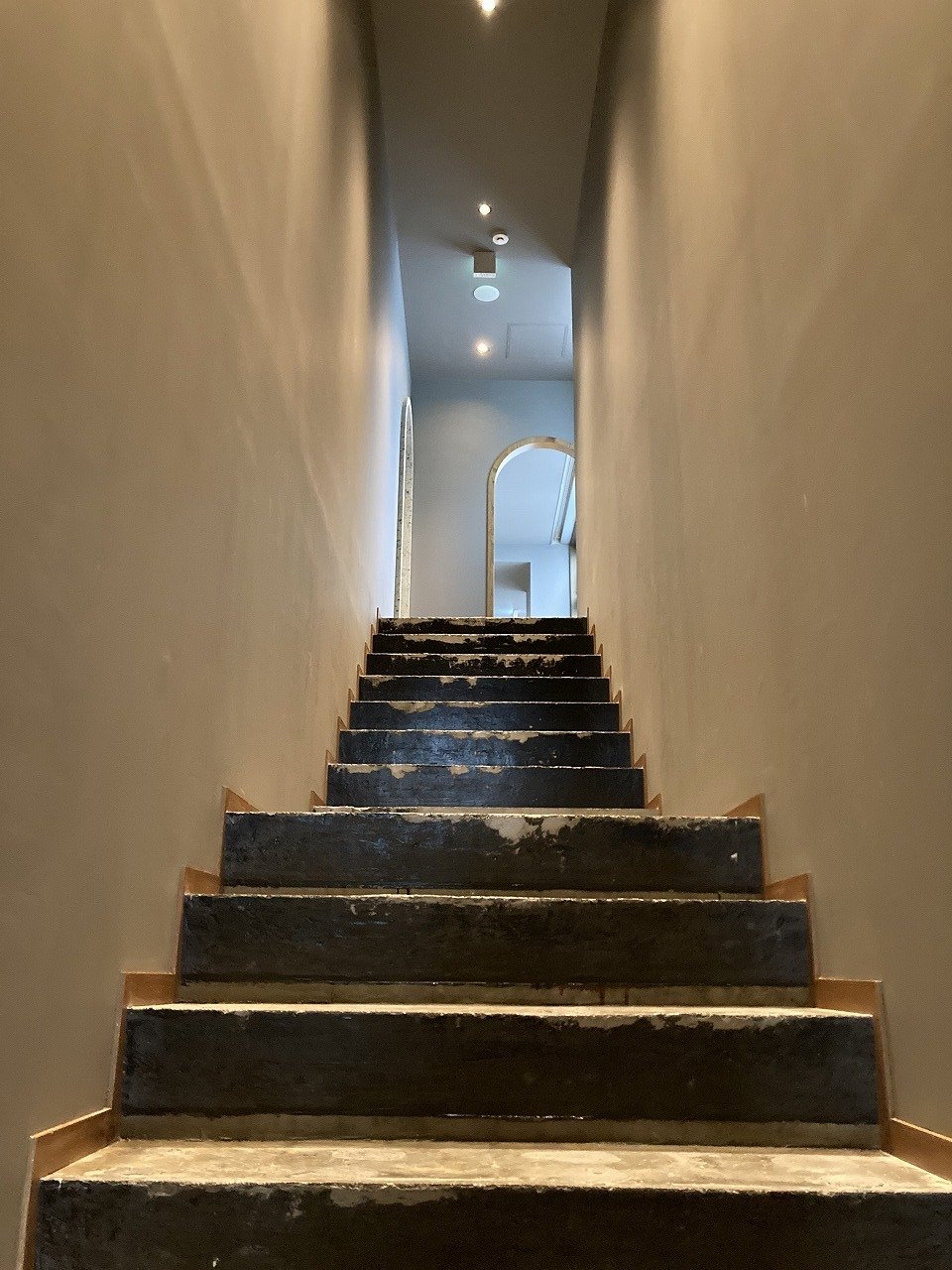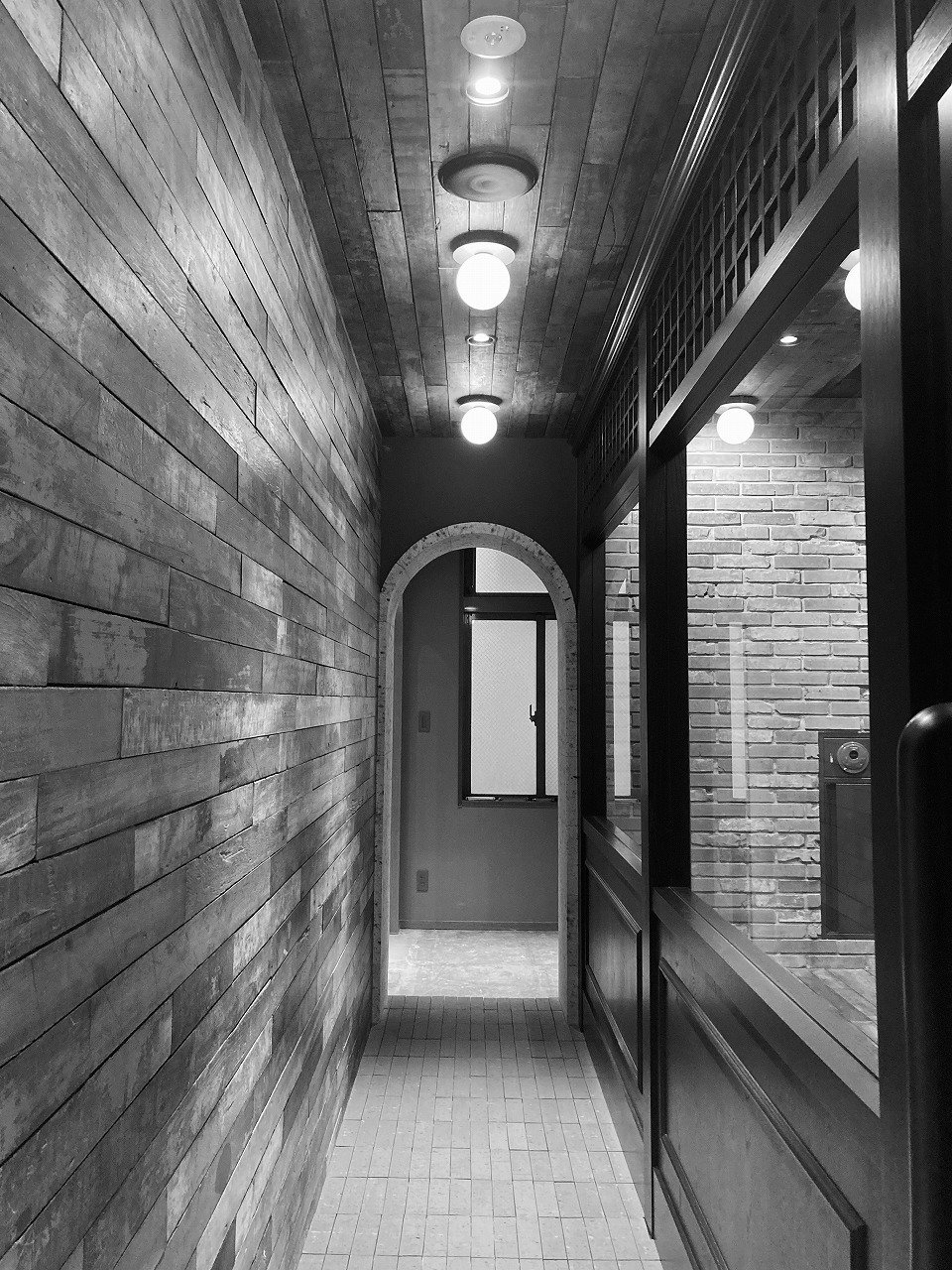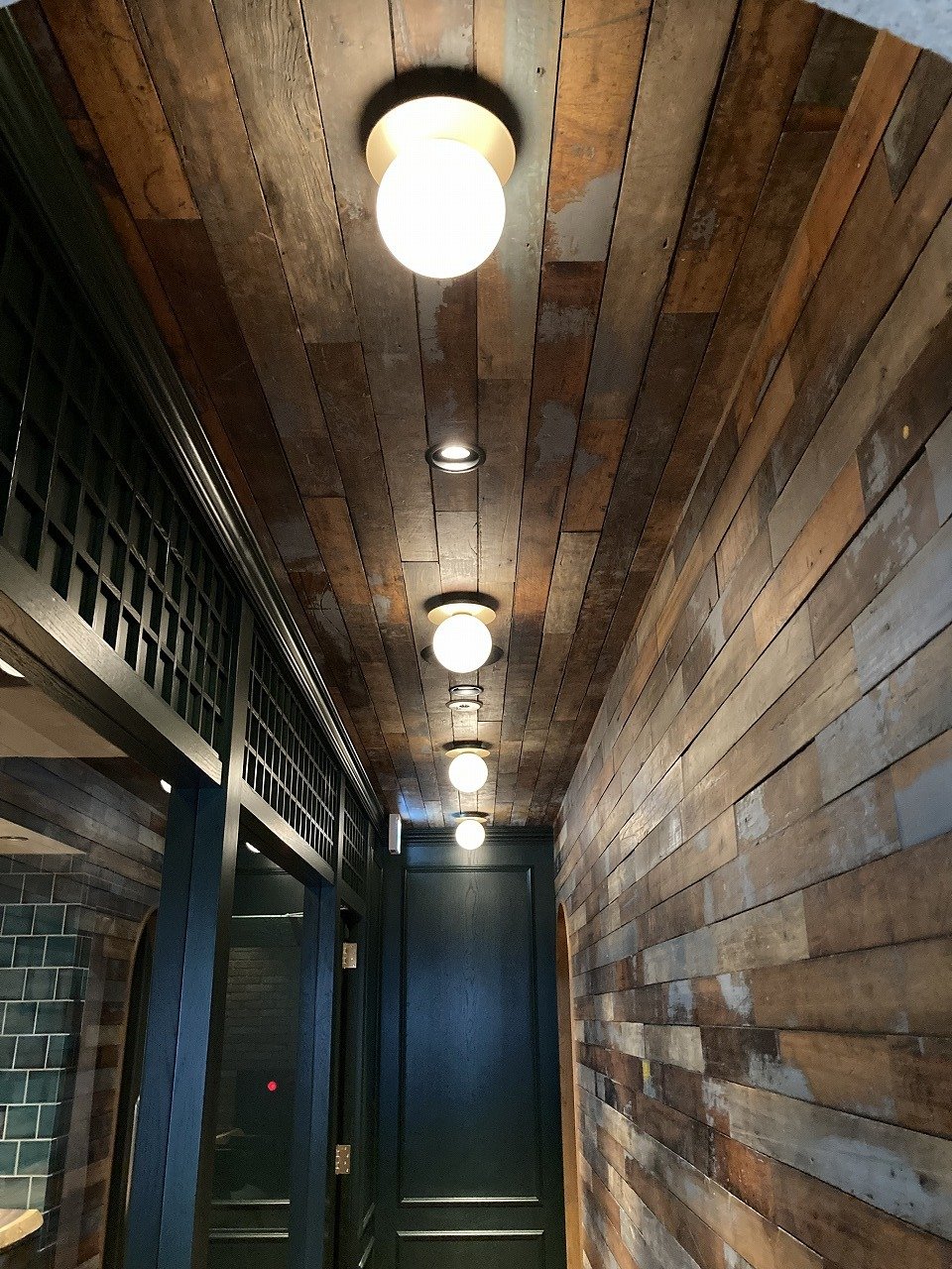 アプローチの壁面と天井面がとてもオシャレに仕上がってますね。