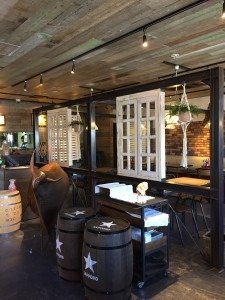 ご覧のとおり天井全面と主要な壁面など贅沢に使っていただいており、わずかに残るペンキ跡もカントリー調なお店のイメージとぴったりマッチしてますね~!