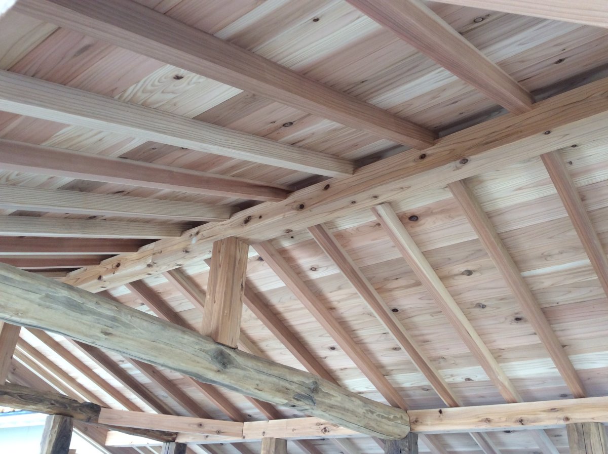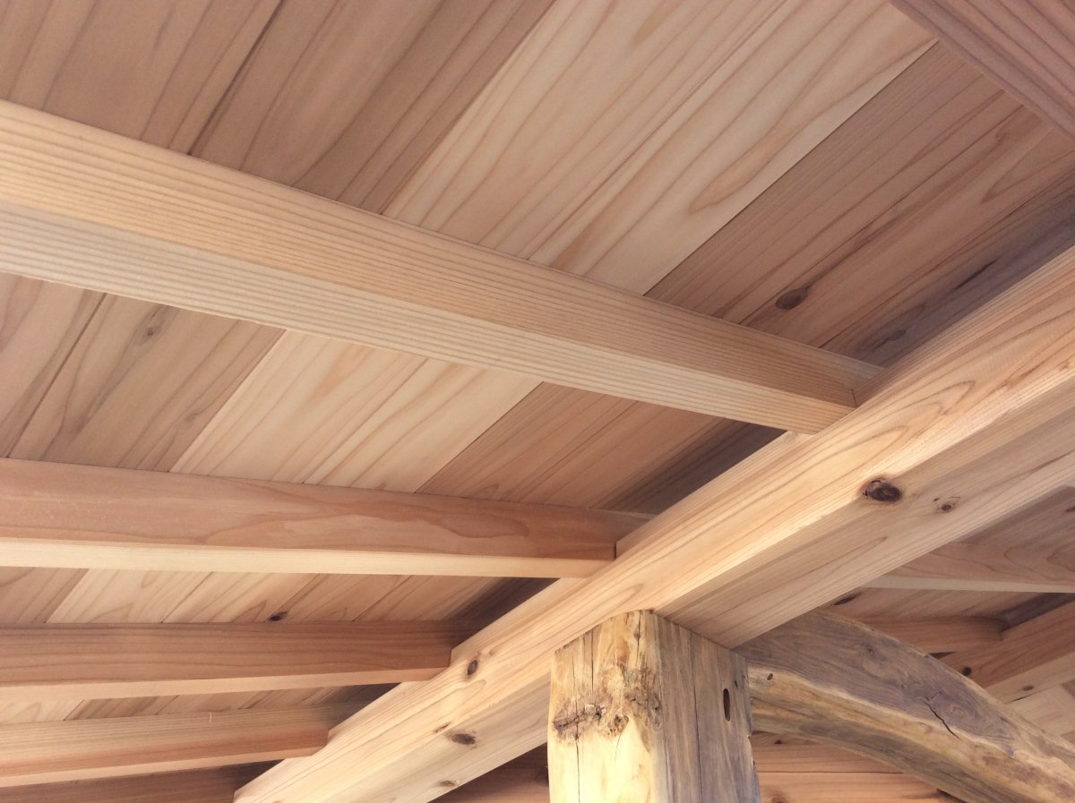 屋根は新材の秋田杉を利用、屋根裏はこだわりの秋田杉本実板貼りとなっております。