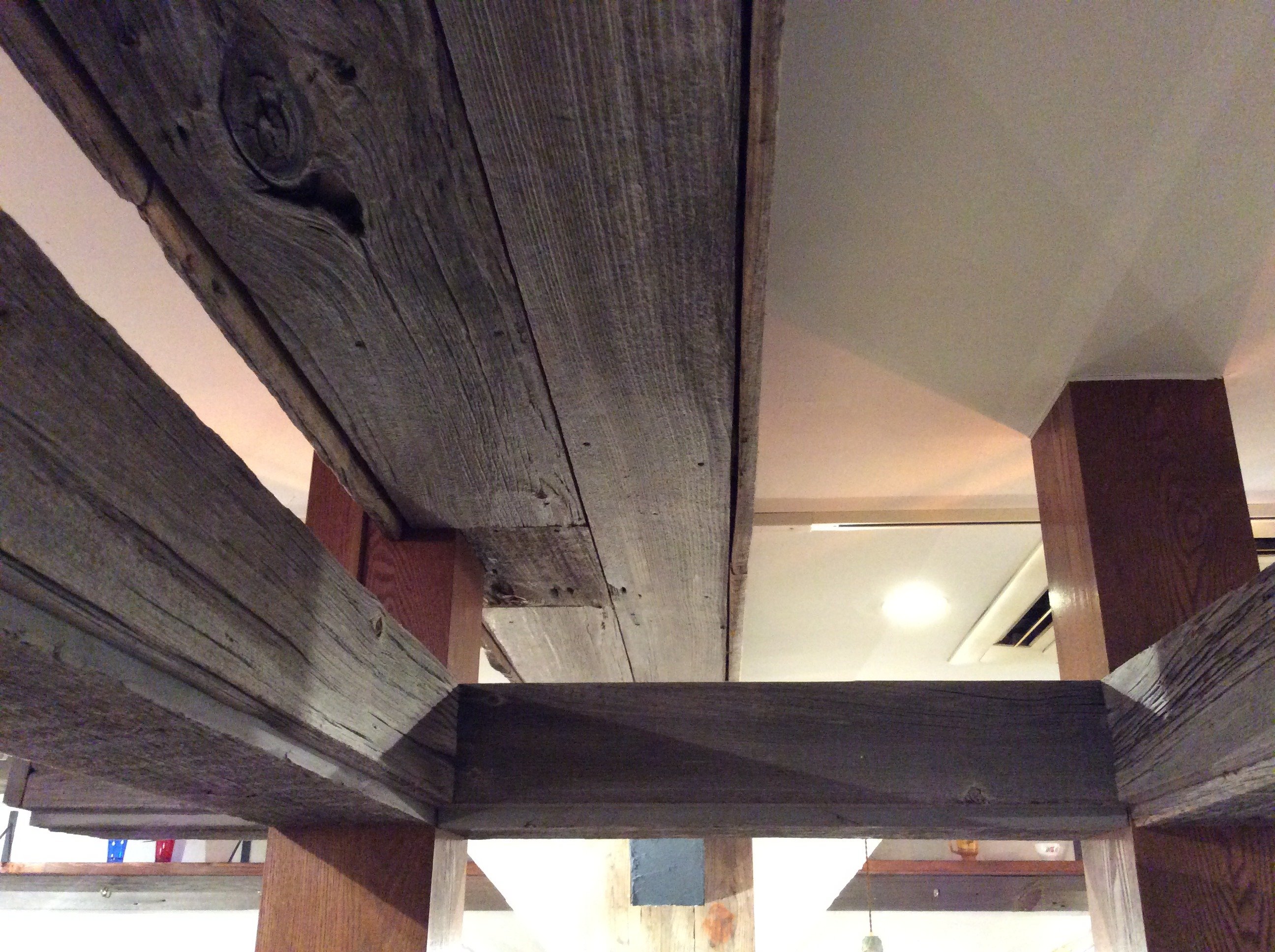 天井の梁型や壁面飾りには「USボード(バーンウッド) グレータイプ」を、そして一部壁面飾りとしてユーズドプレーン (古材足場板)を使用しております。