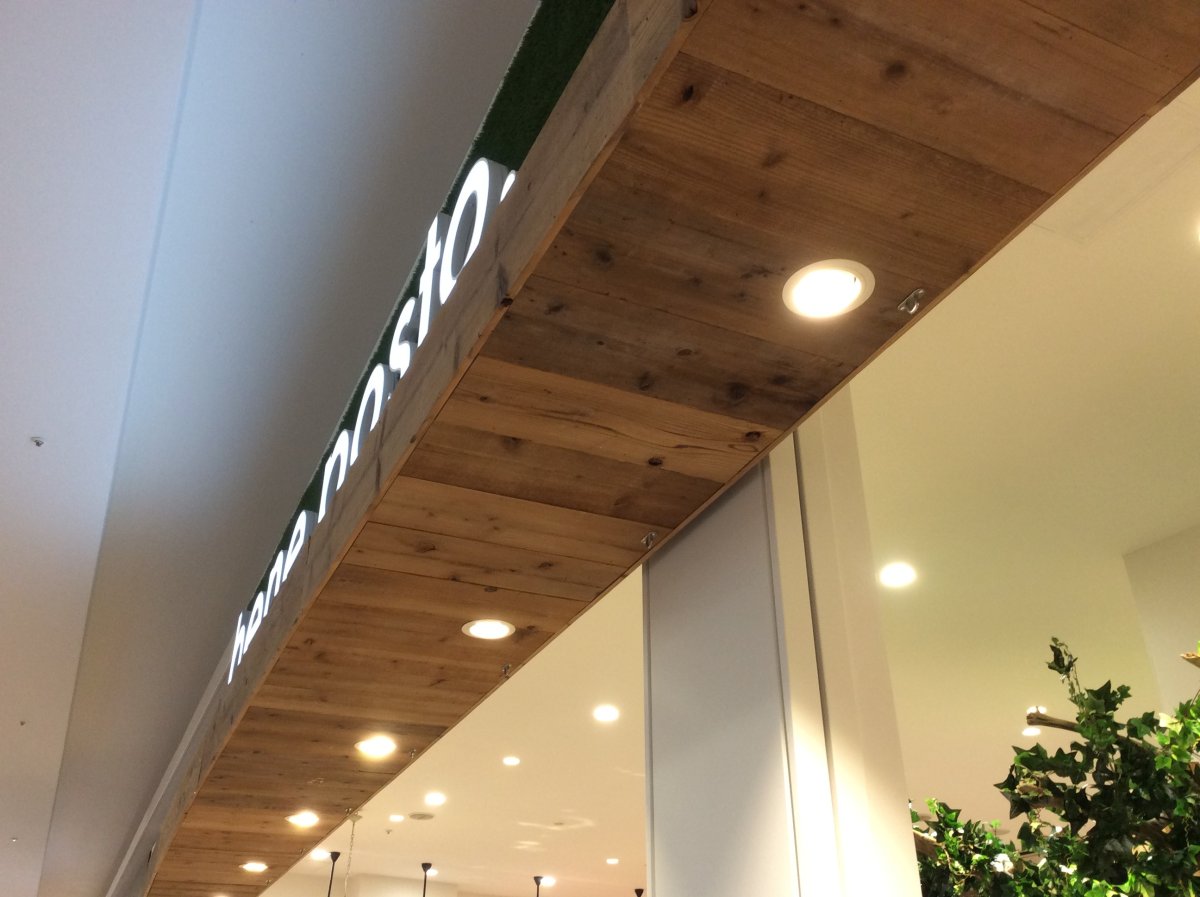今回こちらの天井・壁面ファサード部分に古材日和グループオリジナル板材「ユーズドプレーン」不燃タイプをご採用いただいております。