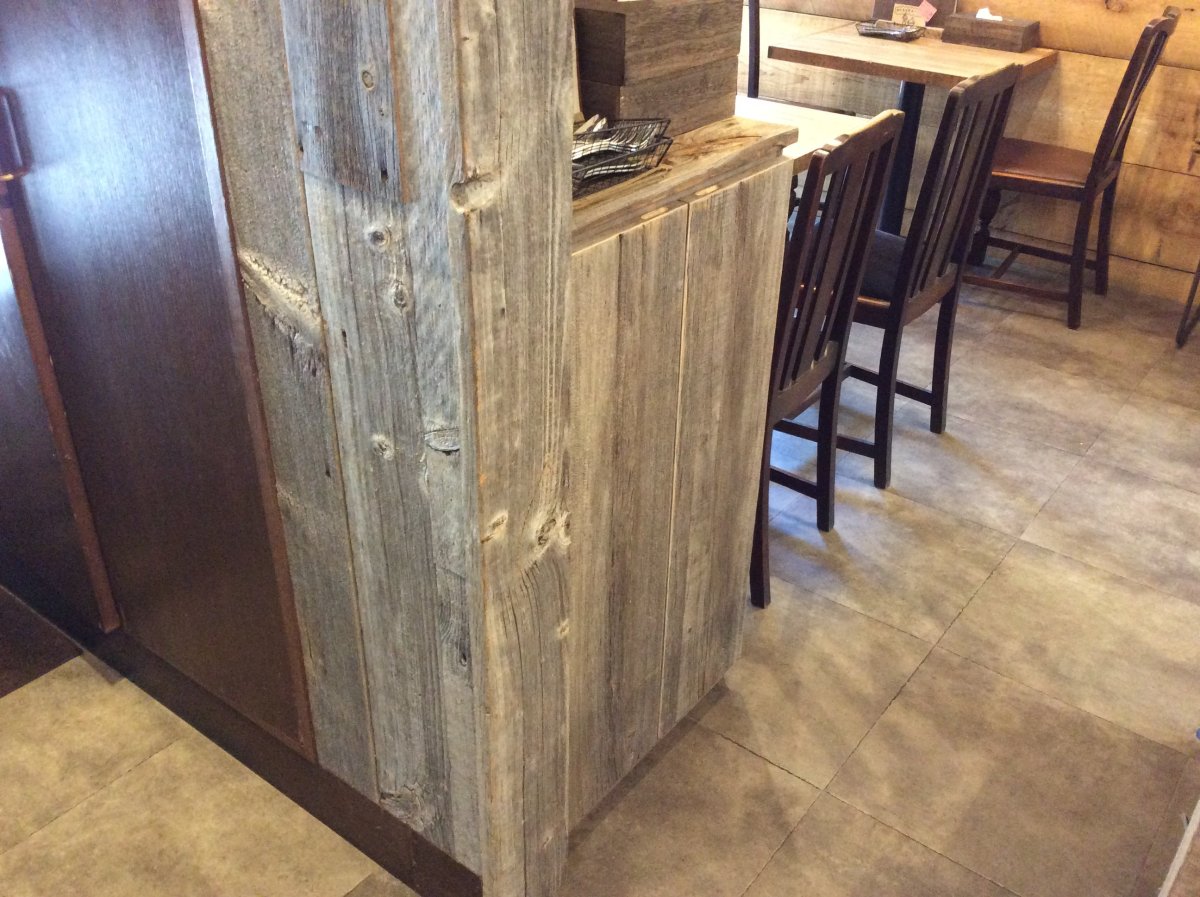 店内の柱梁型・飾り縁の他、腰壁面や什器などいたるところに「USボード(バーンウッド) グレータイプ」&「USボード(バーンウッド) ブラウンタイプ」をそれぞれ部分的に貼り分けしております。