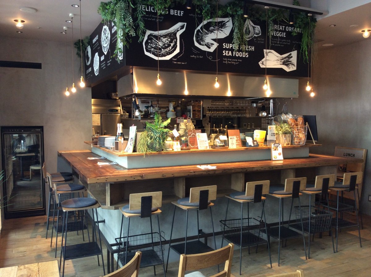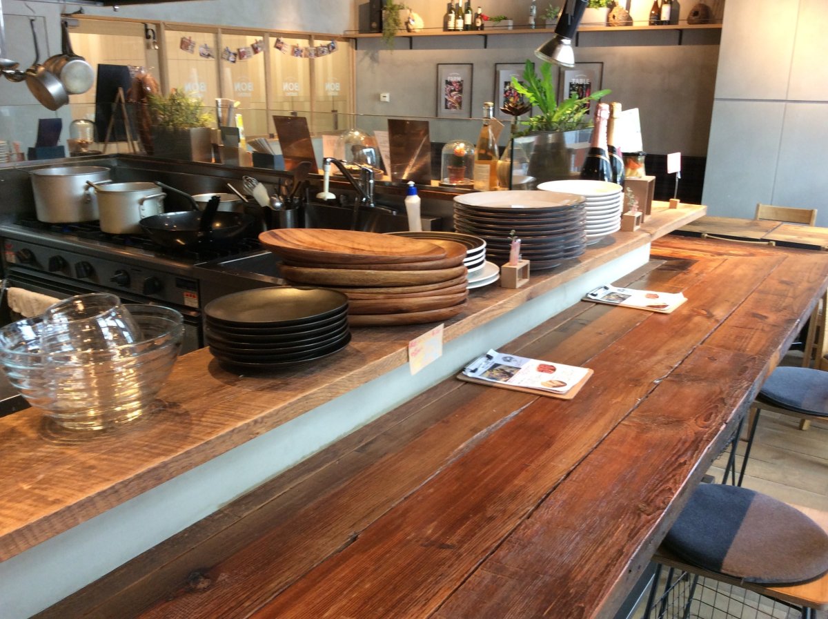 こちらの1階、「大衆ビストロ BON」には当グループの人気シリーズ輸入古材板代表USボード(2インチタイプ)&「USボード(バーンウッド) ブラウンタイプ」幅広プレミアムをご採用いただきました。使用箇所はカウンター天板やテーブル天板になります。