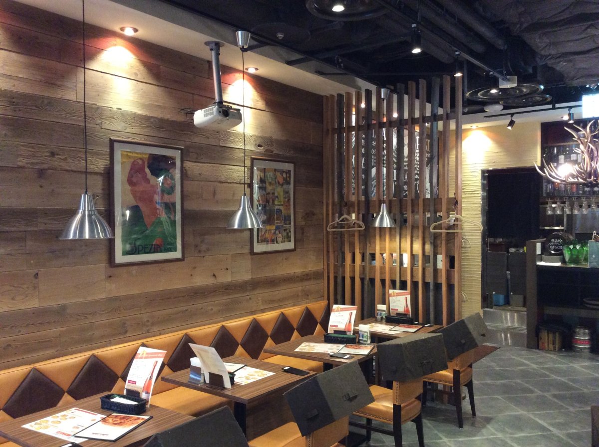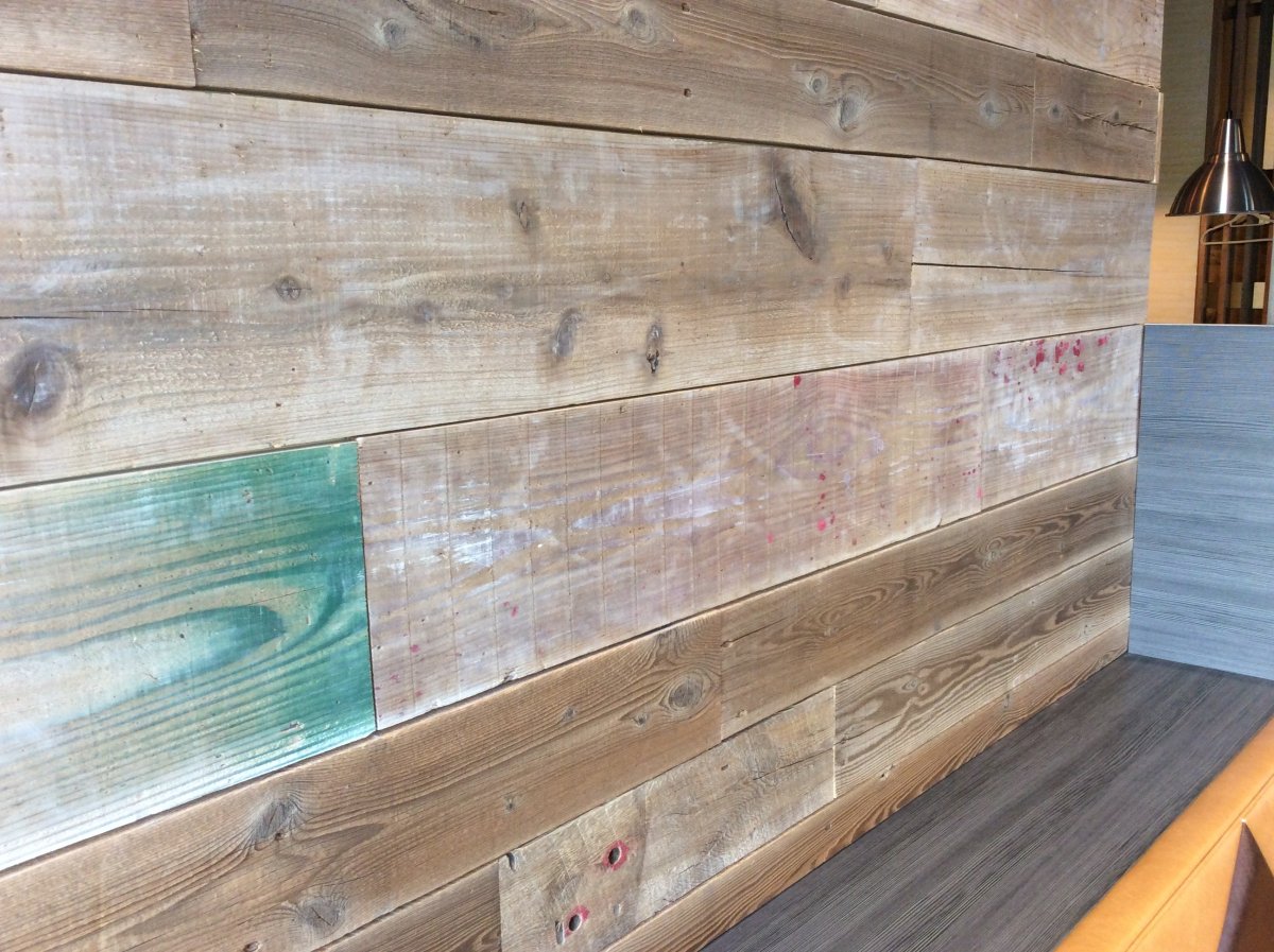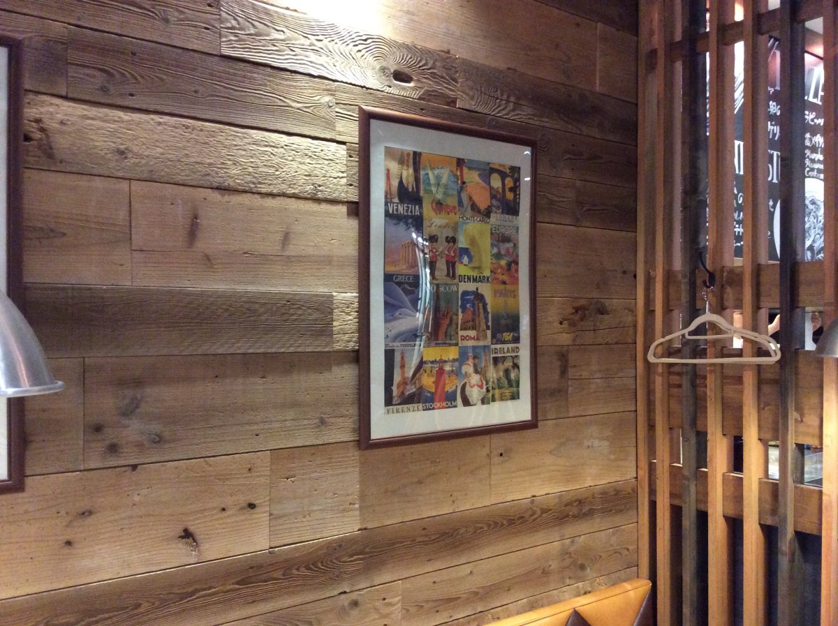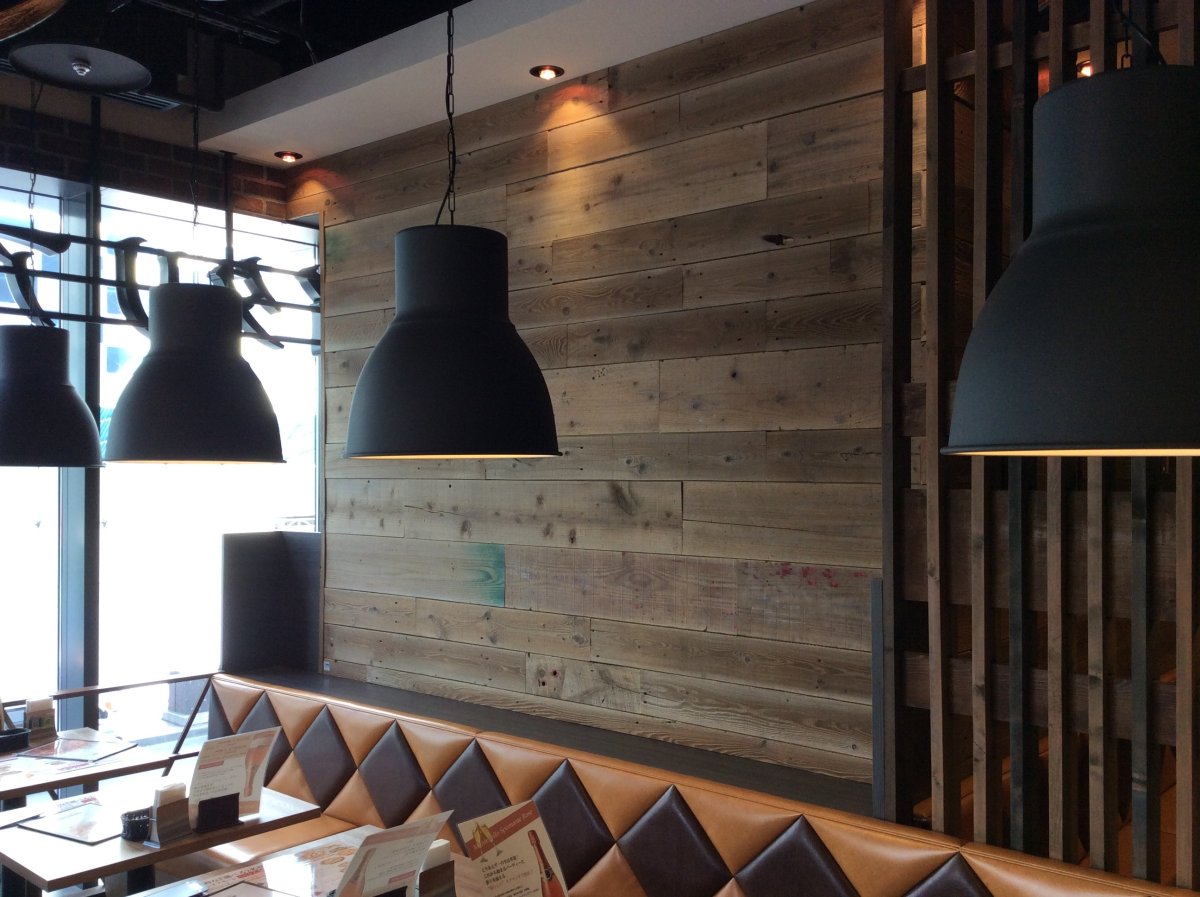 今回こちらの2階フードレストラン、北海道イタリアンバル「ミアボッカ」には古材日和オリジナル不燃古材の「USボードブラウン」そして「ユーズドプレーン」をご採用いただきました。