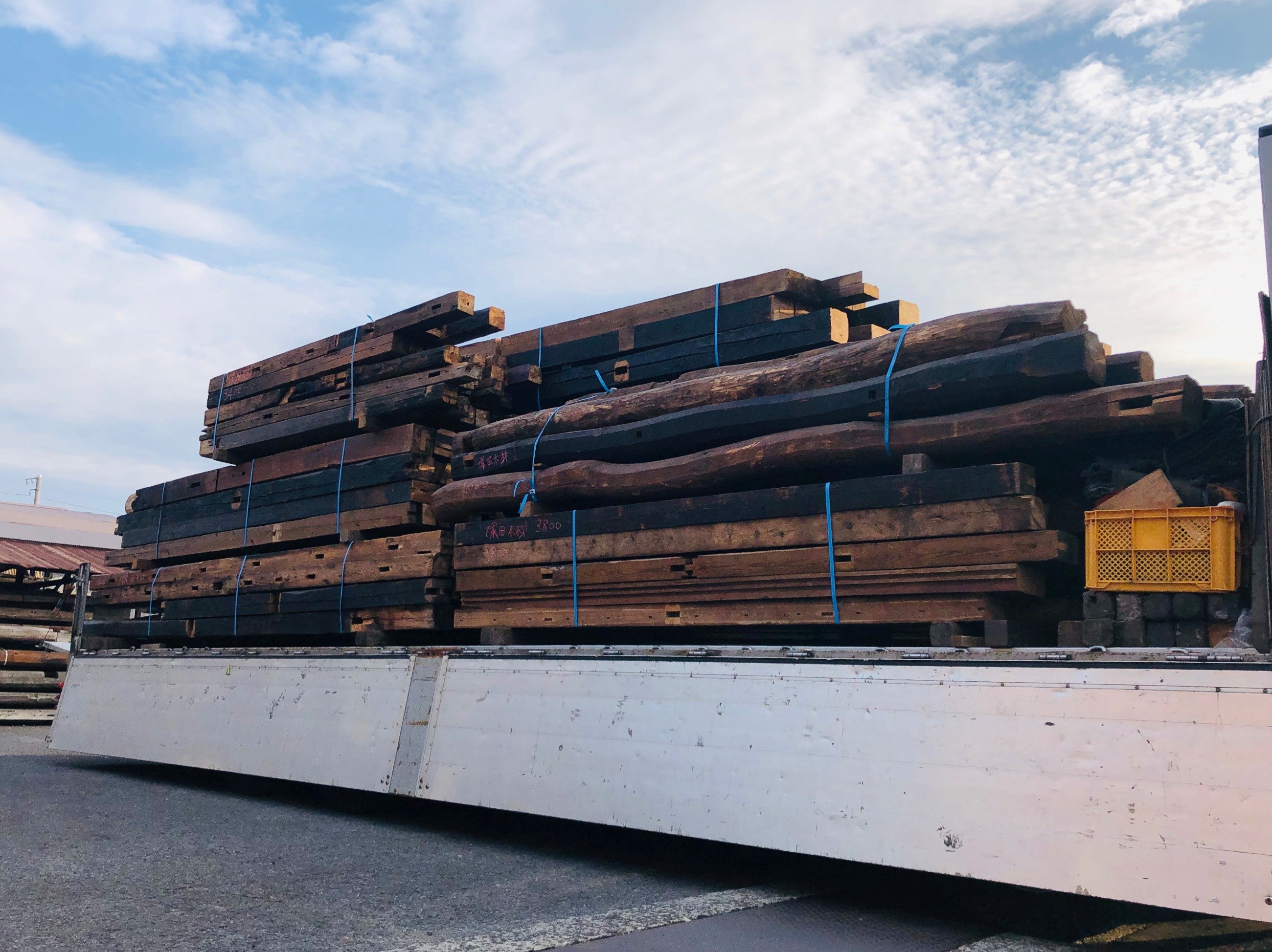トレーラーに満載された古材は、東北・北陸地域を中心に収集し、さらにそのなかから厳選した上物です。