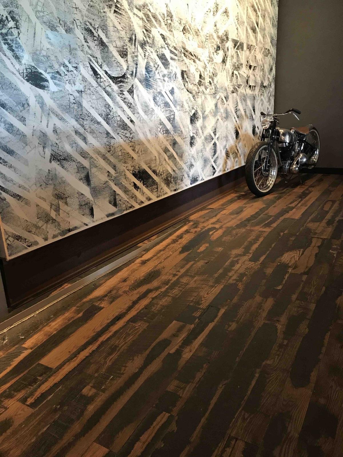 そのブラック色のフェンス材を丁寧に採取して古材フローリングとして加工いたしました。