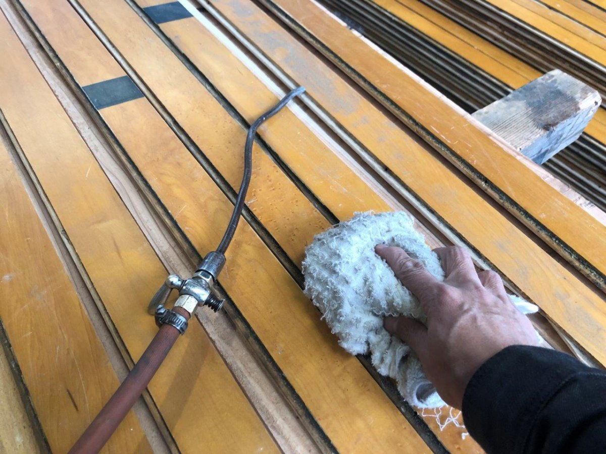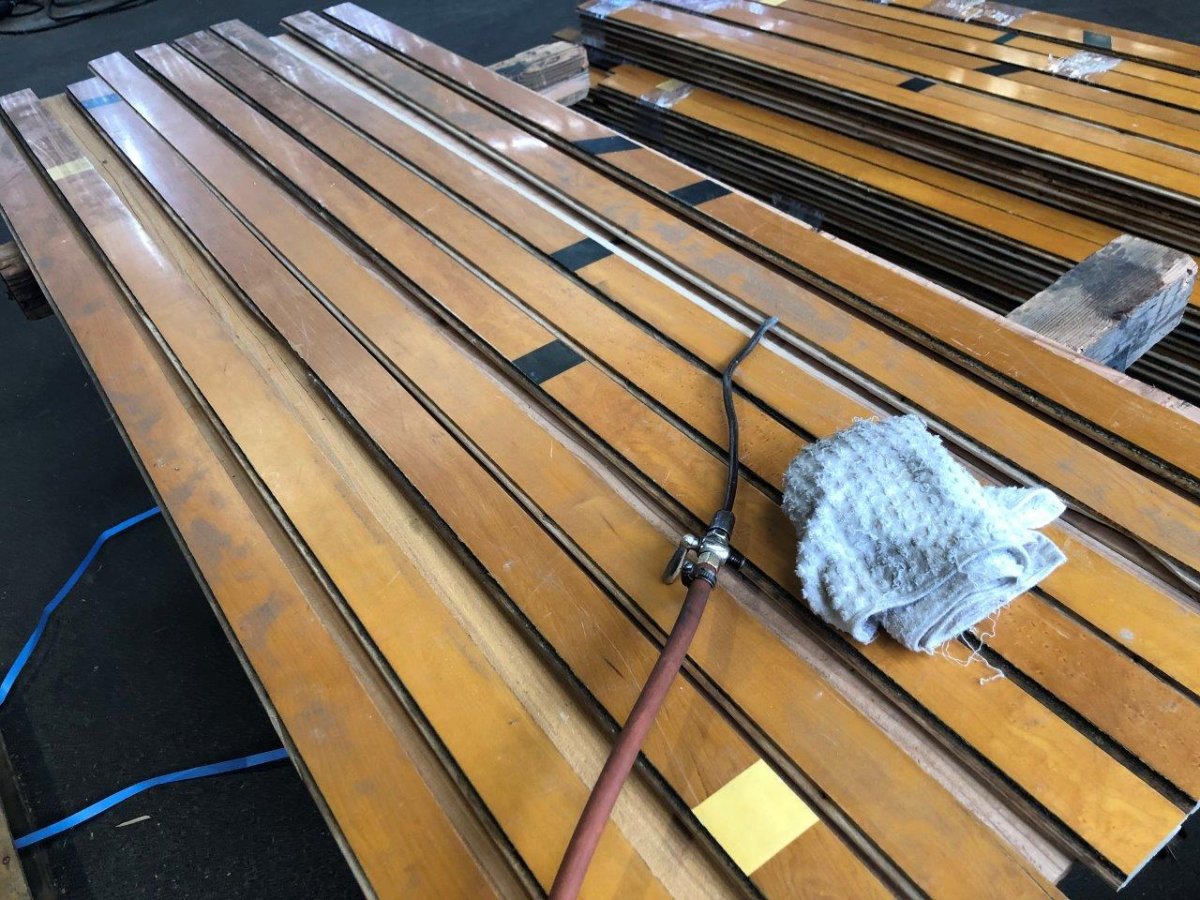 ジムフローリングは表面の塗装の塗膜を守るために、クリーニングマシンは使わず、手作業でひたすら一枚一枚整備します、、、