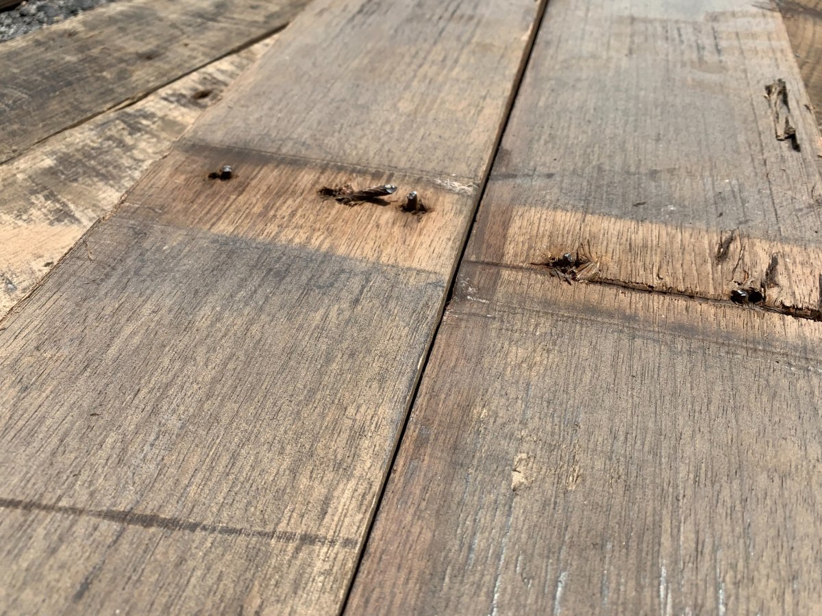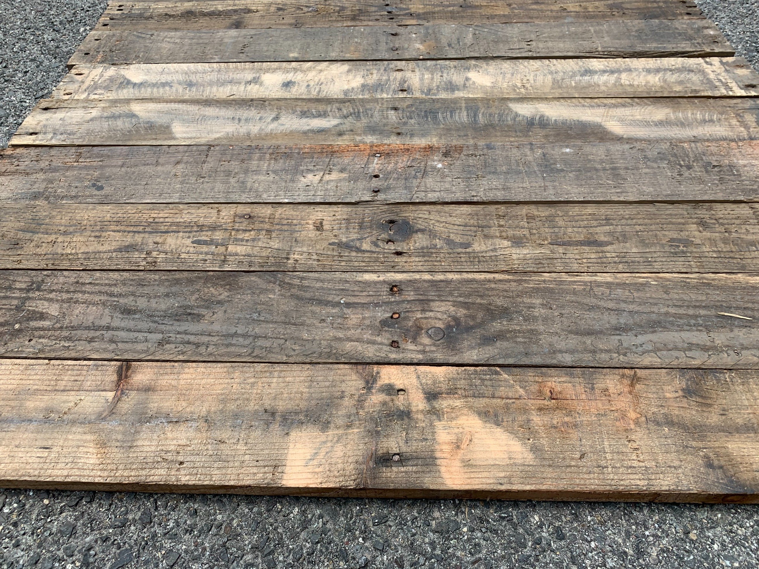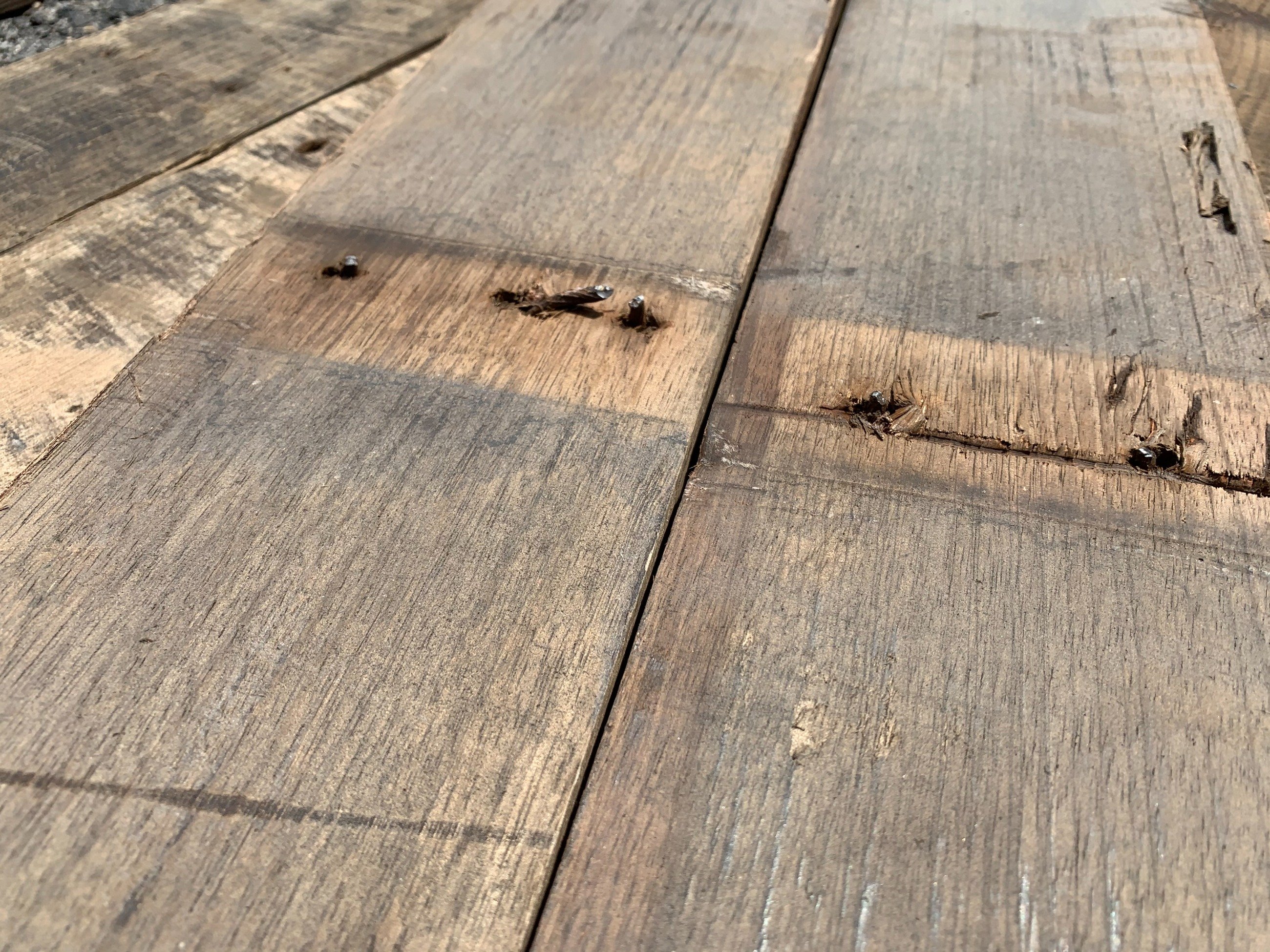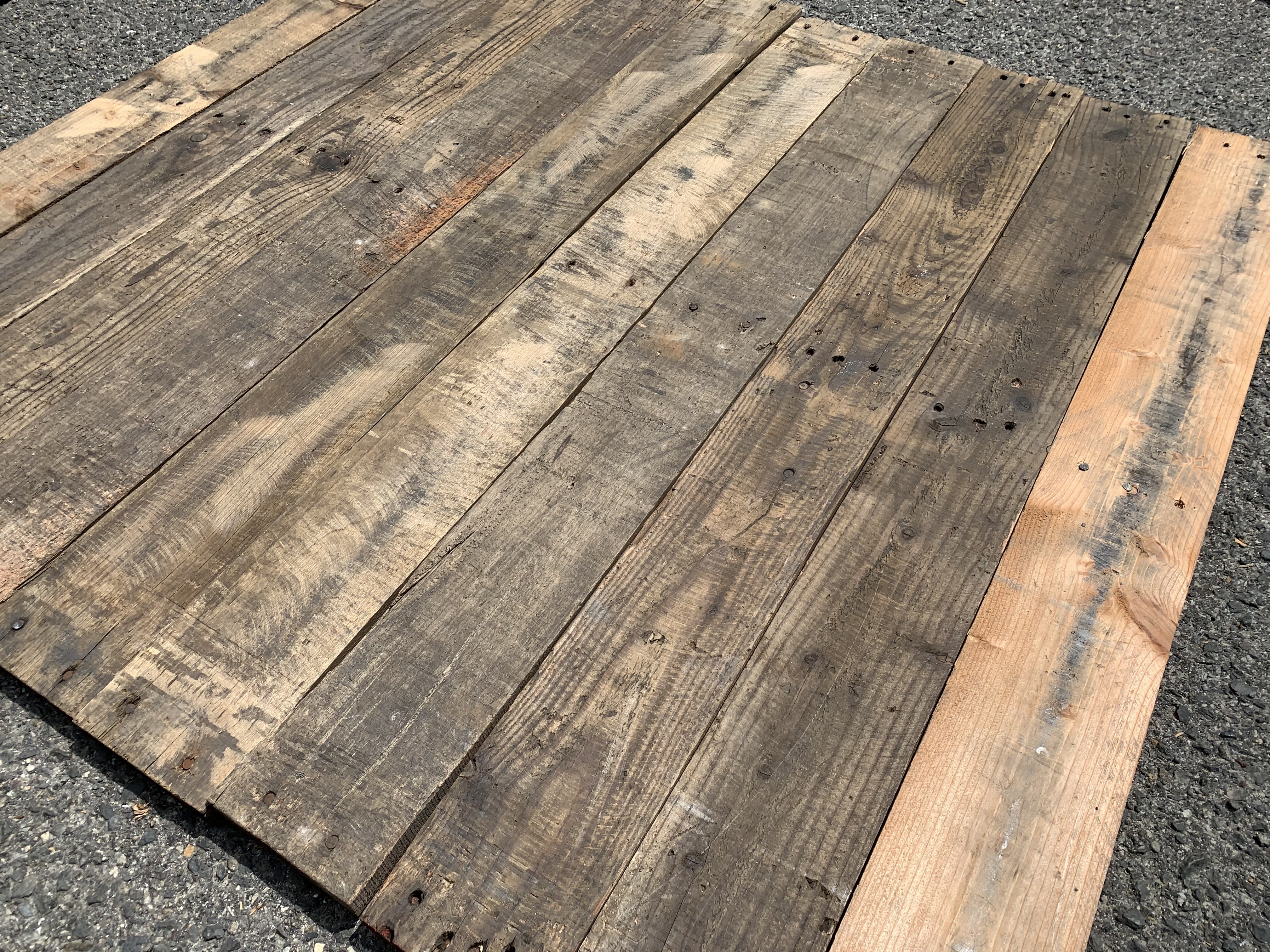 こちらは、元々パレット(工場・倉庫・トラックなどの荷物を載せる台のこと)として実際に使われていた木材です。様々な樹種に残るハードな傷は他の古材と一味違ったテイストを楽しめます。