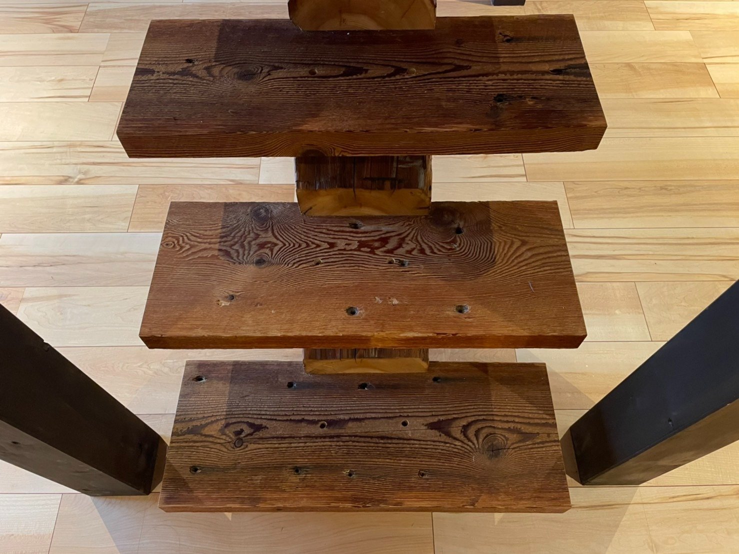 安定した人気を保つ角材。ホゾ穴などの匠の仕事の跡がしっかりと残る一品です。 梁などの巨大なものから、柱などの細めのものまで、大きさは様々。皆様のご要望に応じてアレンジしていきます。また製材(カット)による寸法調整や加工を行うことで、より一層使い安いアイテムへ変化させていくことも可能です。