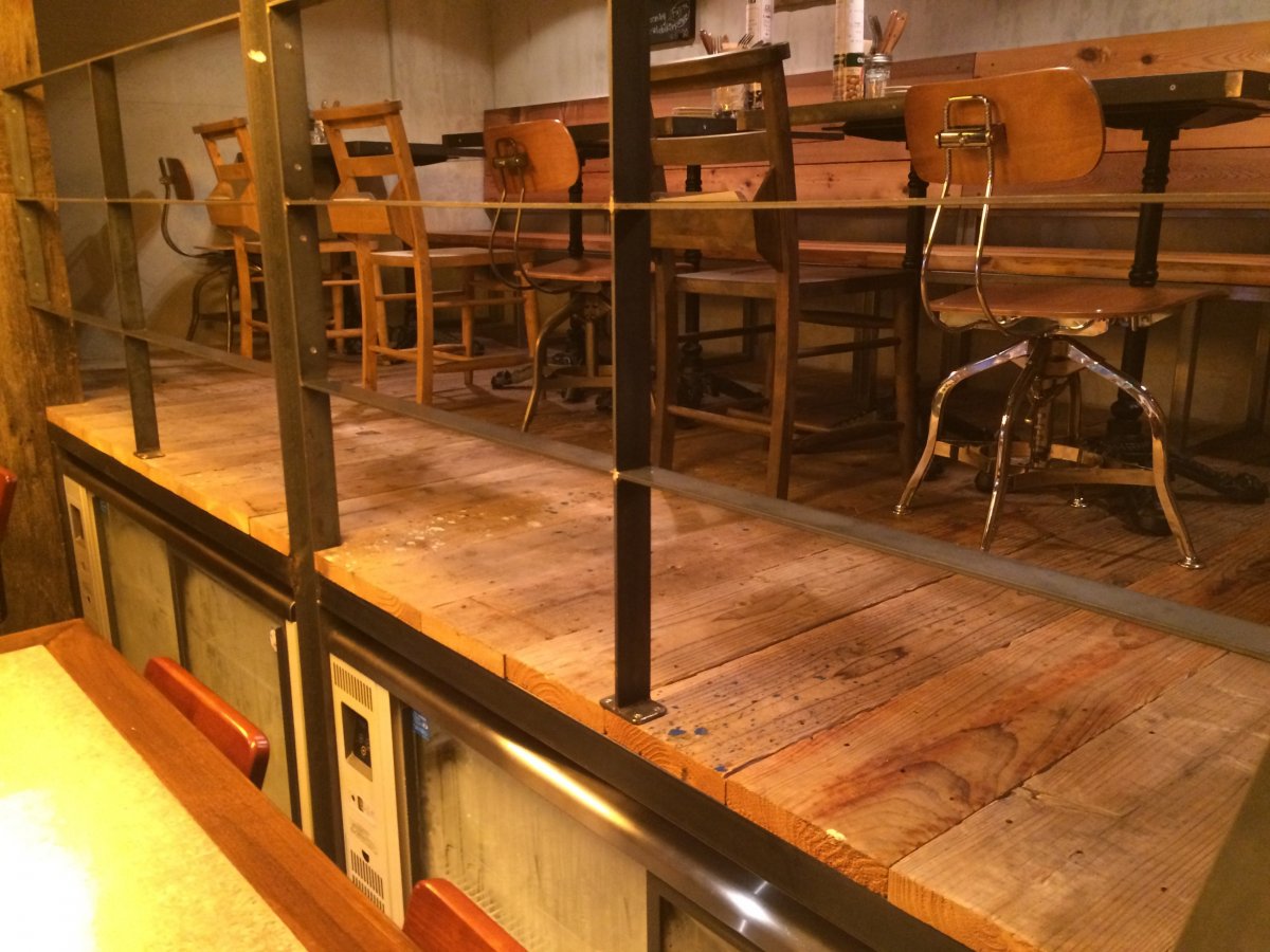 一番奥には小上り席、ここの床材は ユーズドプレーン ( 古材足場板 )35㎜厚!