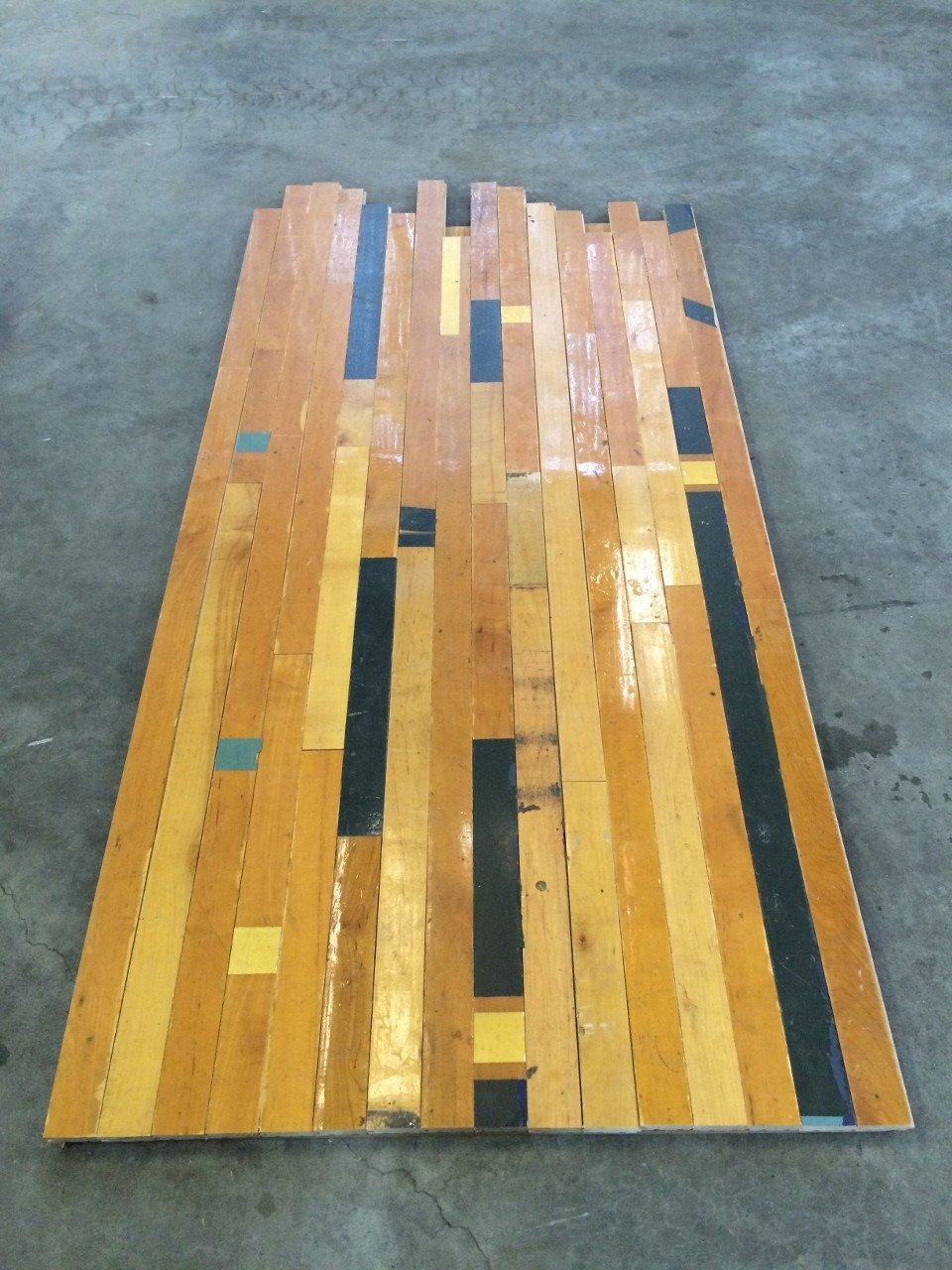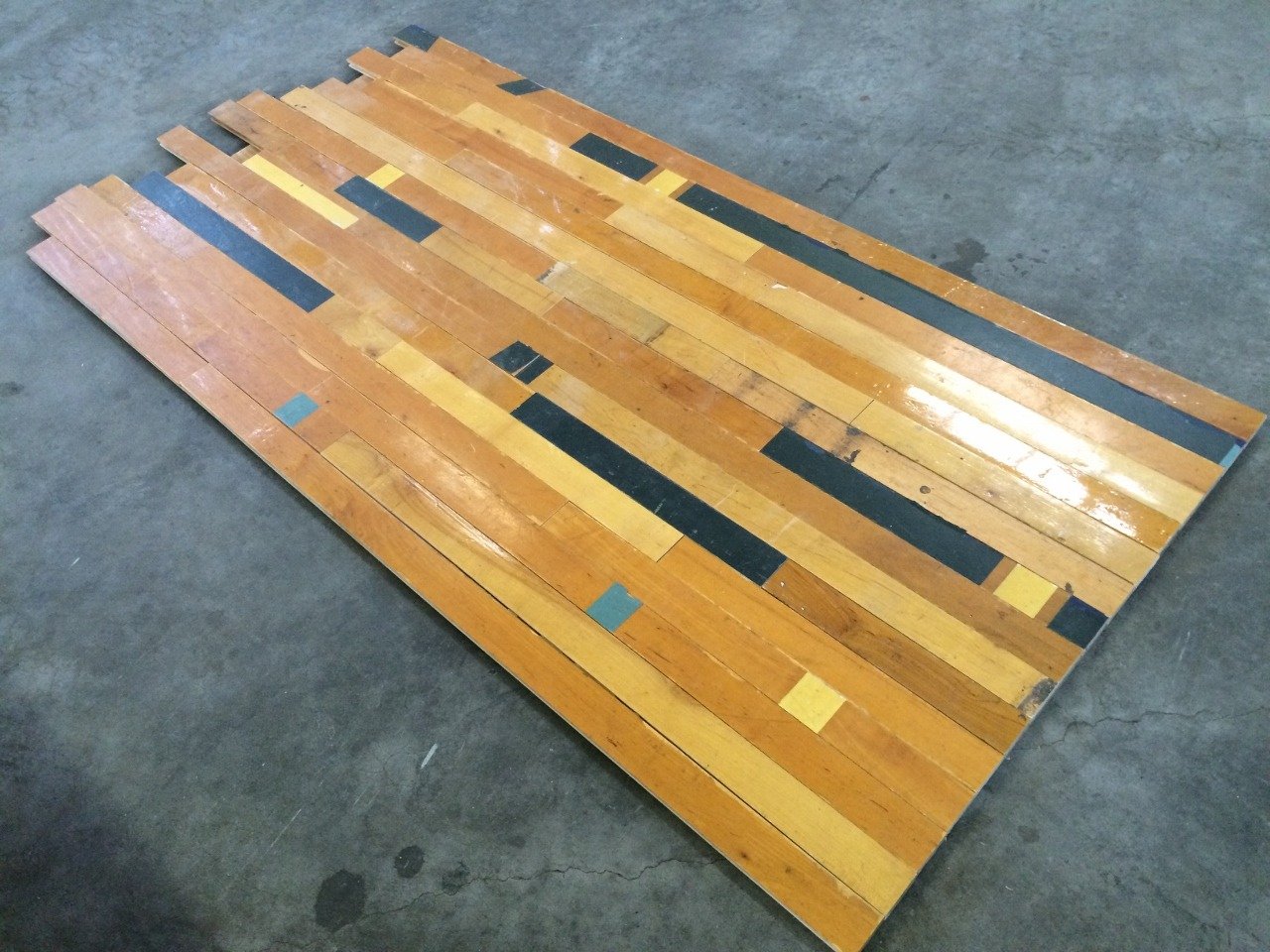 バスケットボールやバレーボールなど屋内スポーツが行われた体育館や運動施設から回収されたメープルフローリングです。カラフルなコートラインが空間に散りばめられ、軽快で遊び心のある外観を作り出します。