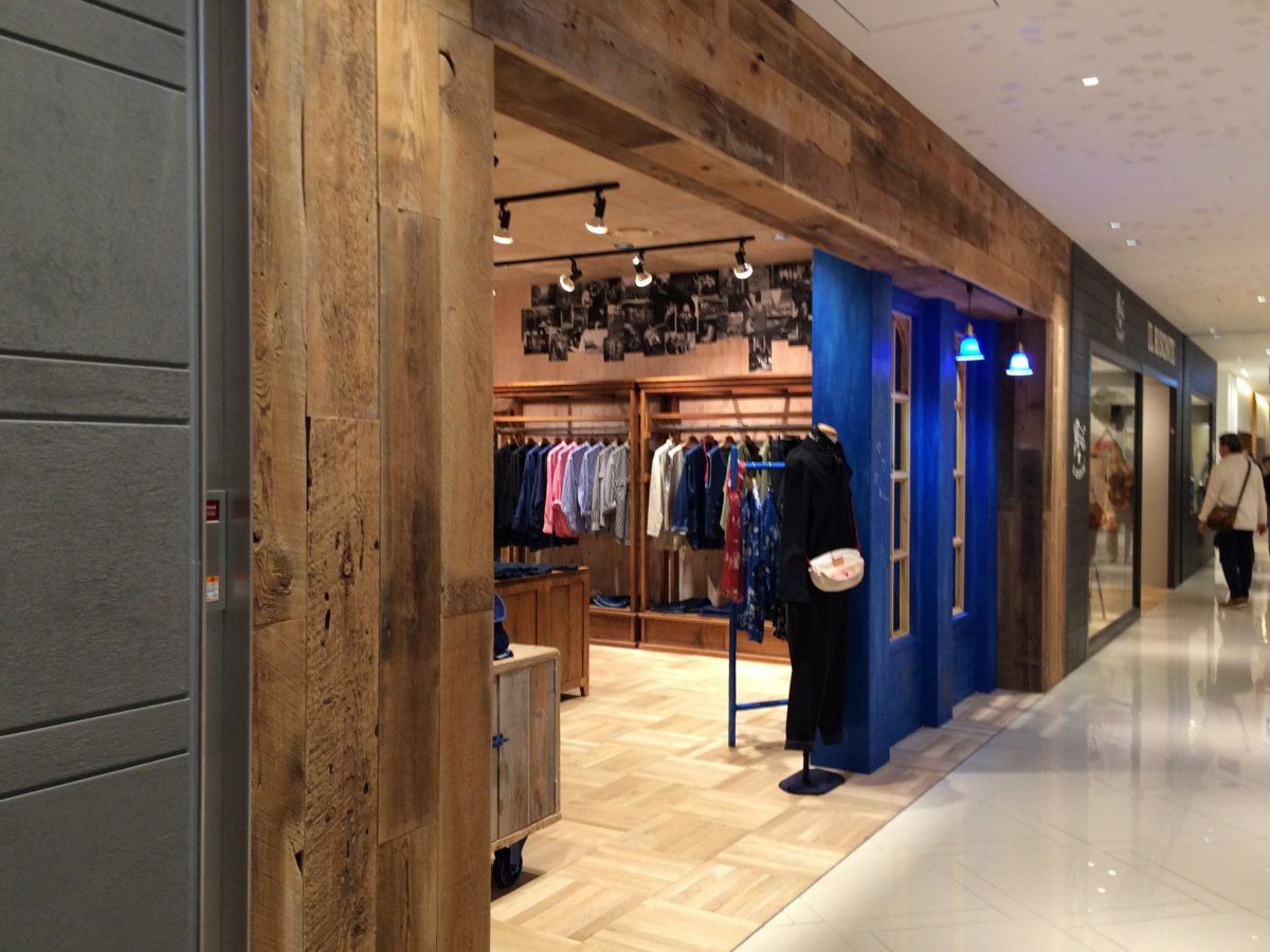 最新鋭のビルに自然素材の木材、その木材が普通の木材ではなく歴史ある風合いが刻まれた古材。