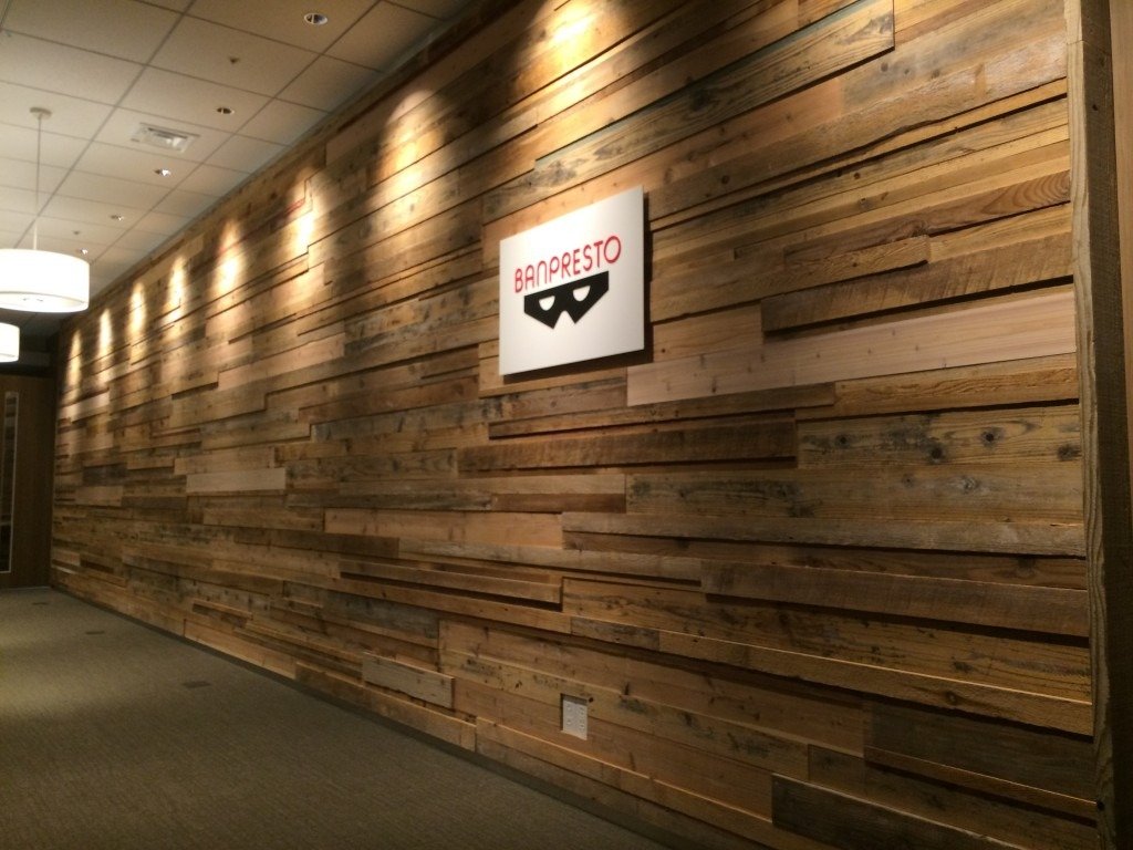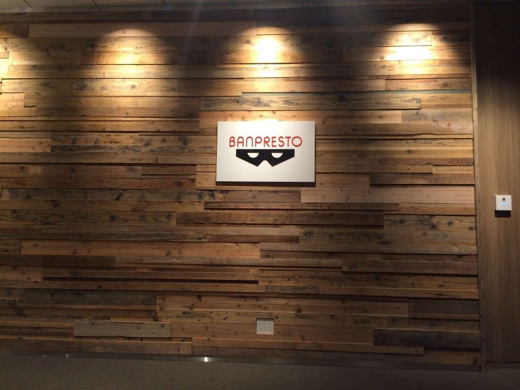 ゲームでおなじみの、株式会社バンプレストさん本社エントランスに古材の壁が登場です!