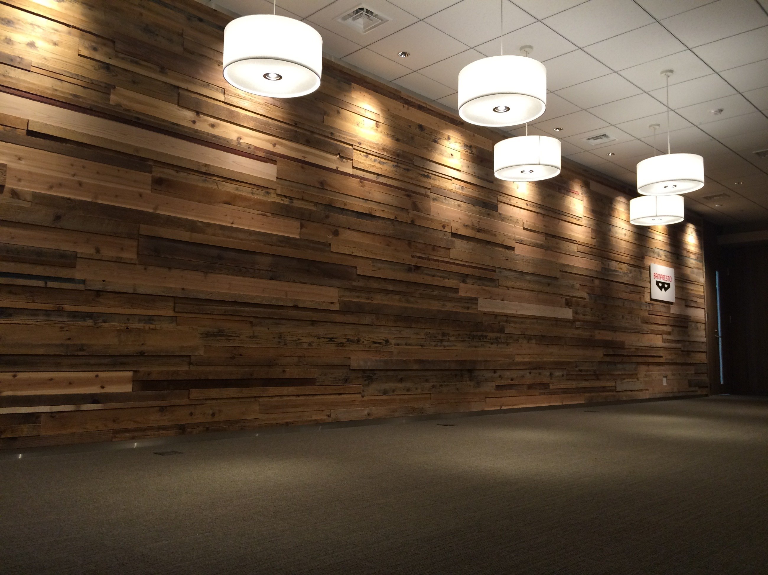 無機質のオフィスビル内に古材の壁、かなりのインパクトです!